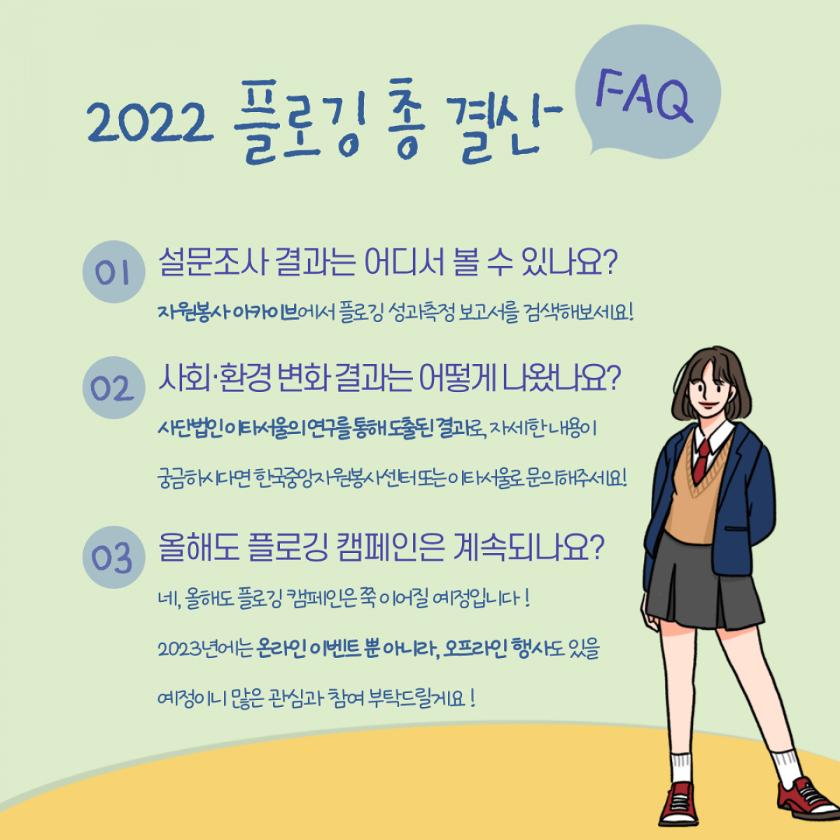 공지사항 [공지] 2022 범국민 플로깅 캠페인 총 결산 2023.03.08 관리자 2022 범국민 플로깅 캠페인 성과 분석보고서.pdf 이전글 [공지] 사회문제 해결형 자원봉사 지원사업 『스케일업(Scale-up) 프로젝트』 공모 안내 목록 다음글 [포상] 2023년 「국가 재난관리 유공」 정부 포상 후보자 공개 검증