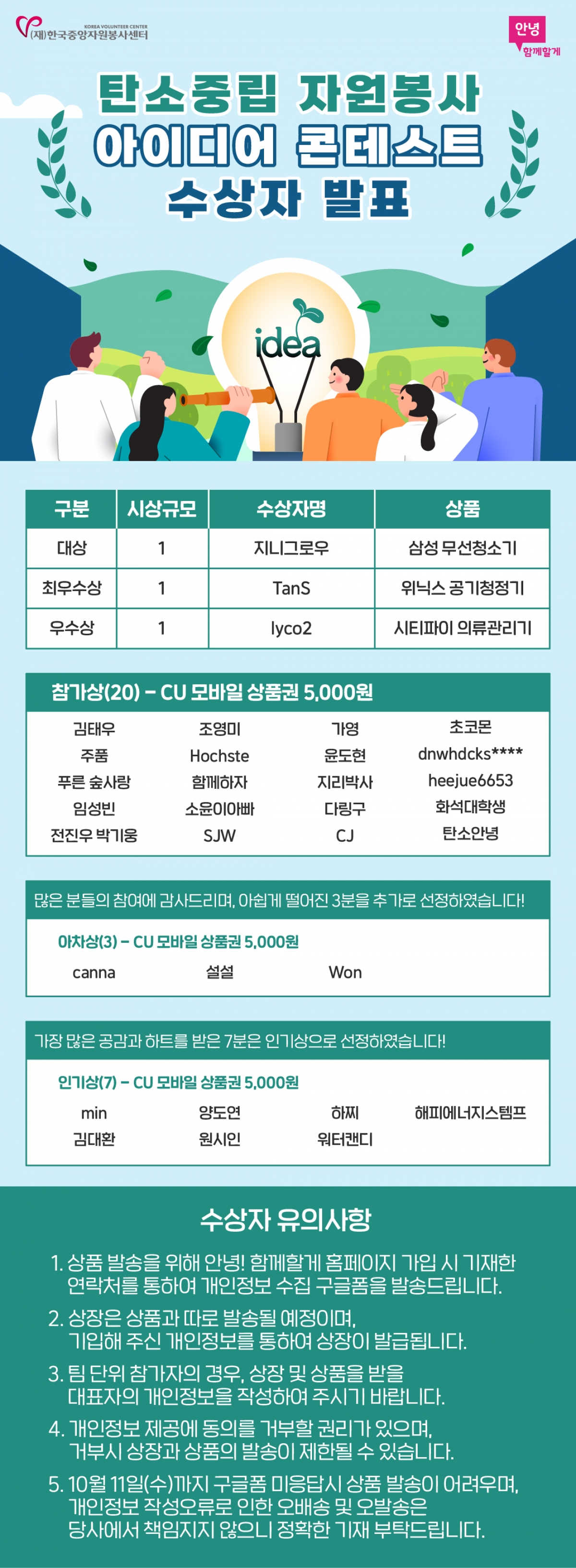 공지사항 [당첨발표] 2023 탄소중립 자원봉사 아이디어 콘테스트 2023.10.05 관리자 이전글 [당첨발표] 안녕! 산해진미 함께할게 이벤트 : 플로깅 명소를 찾아라! 목록 다음글 [당첨발표] 2023 탄소중립 자원봉사 아이디어 콘테스트 투표 이벤트