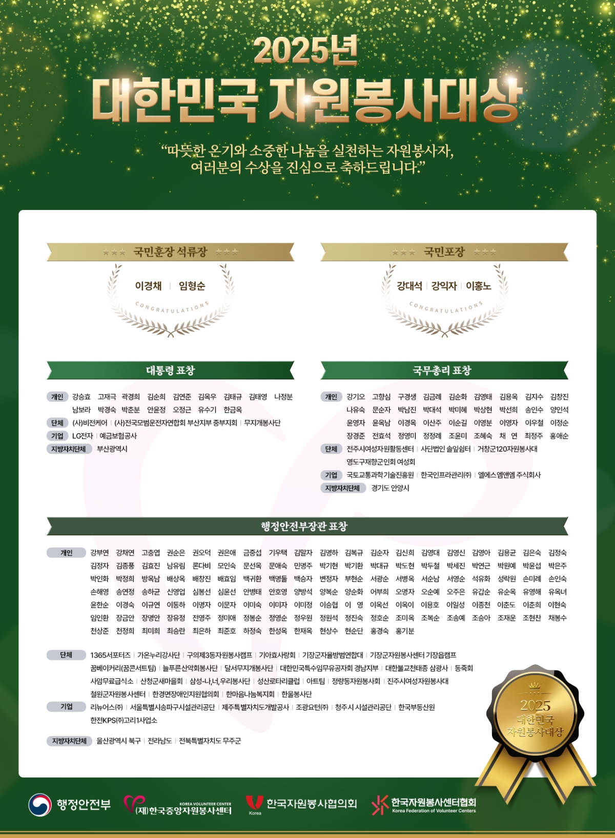공지사항 2025년 대한민국 자원봉사대상 수상자 결과 안내 2025.11.28 (재)한국중앙자원봉사센터 붙임. 2025년 대한민국 자원봉사대상 수상자 명단 (공지).xlsx 이전글 2025 세계자원봉사자의 해 대한민국 선포식 및 UN 런칭행사 안내 목록 다음글 [공지] 제1회 대한민국 봉사와 나눔 우수사례 공모전 수상작 결과 안내