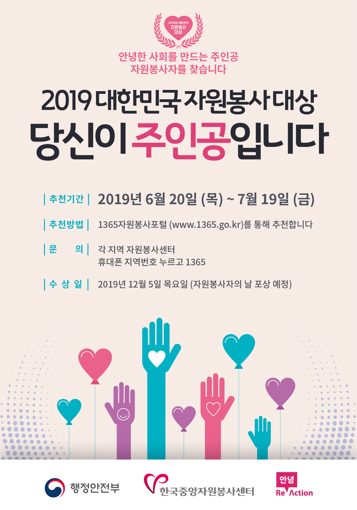 행정안전부에서는「자원봉사활동 기본법」 제12조(포상)와 관련하여,「2019 대한민국 자원봉사대상」을