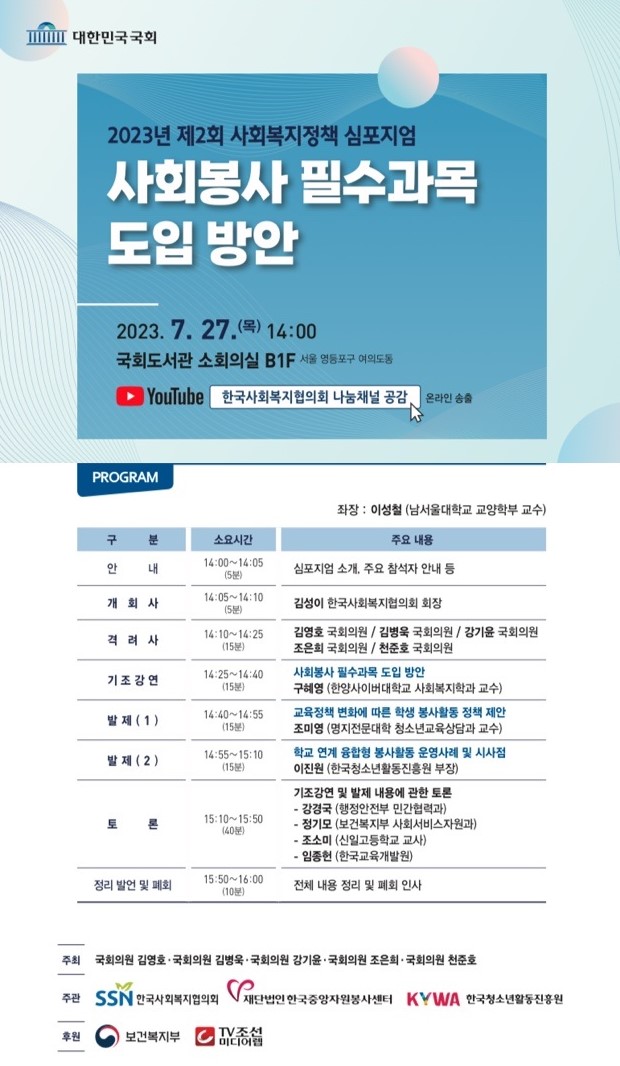 2023년 제2회 사회복지정책 심포지엄 「사회봉사 졸업필수과목 도입 방안」 개최