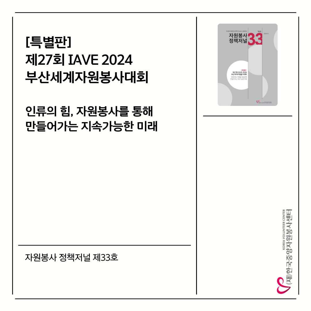 제33호 저널의 주제는 [특별판] 제27회 IAVE 2024 부산세계자원봉사대회 '인류의 힘, 자원봉사를 통해 만들어가는 지속가능한 미래'입니다.