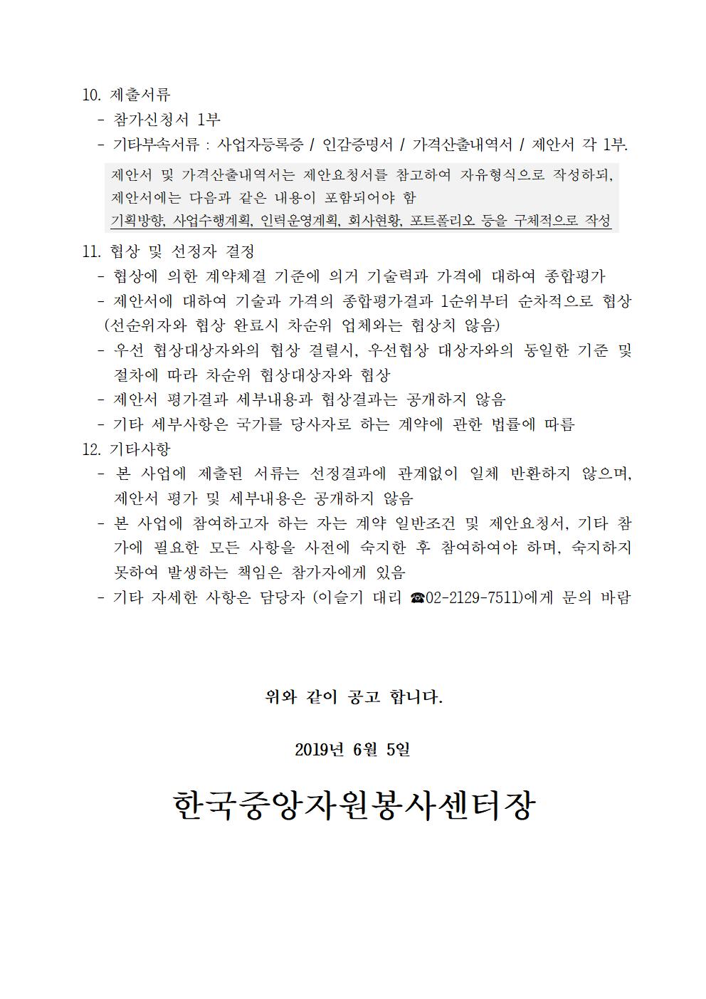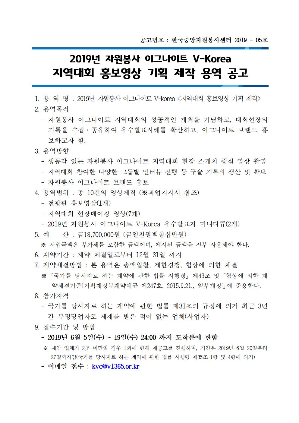 입찰/채용 (공고2019-05) 2019년 자원봉사 이그나이트 V-Korea지역대회 홍보영상 기획 제작 용역 공고 2019.06.05 관리자 붙임. 과업지시서.pdf 붙임. 용역 공고문.pdf 붙임. 참가신청서.hwp 이전글 (공고2019-05) 2019년 자원봉사 이그나이트 V-Korea지역대회 홍보영상 기획 제작 용역 재공고 목록 다음글 한국중앙자원봉사센터 정규직 직원 채용 결과 공고