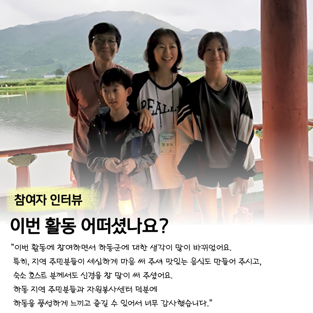 활동사례 [경남 하동군] 하동 자원봉사 첫 걸음, 인생 2막 첫 걸음 관리자 2024.12.04 228 이전글 [경북 의성군] 여행 어때? 봉사 어때! 의성 어때~ 목록 다음글 [사업소개] 지역활력 스케일업(Scale-up) 프로젝트