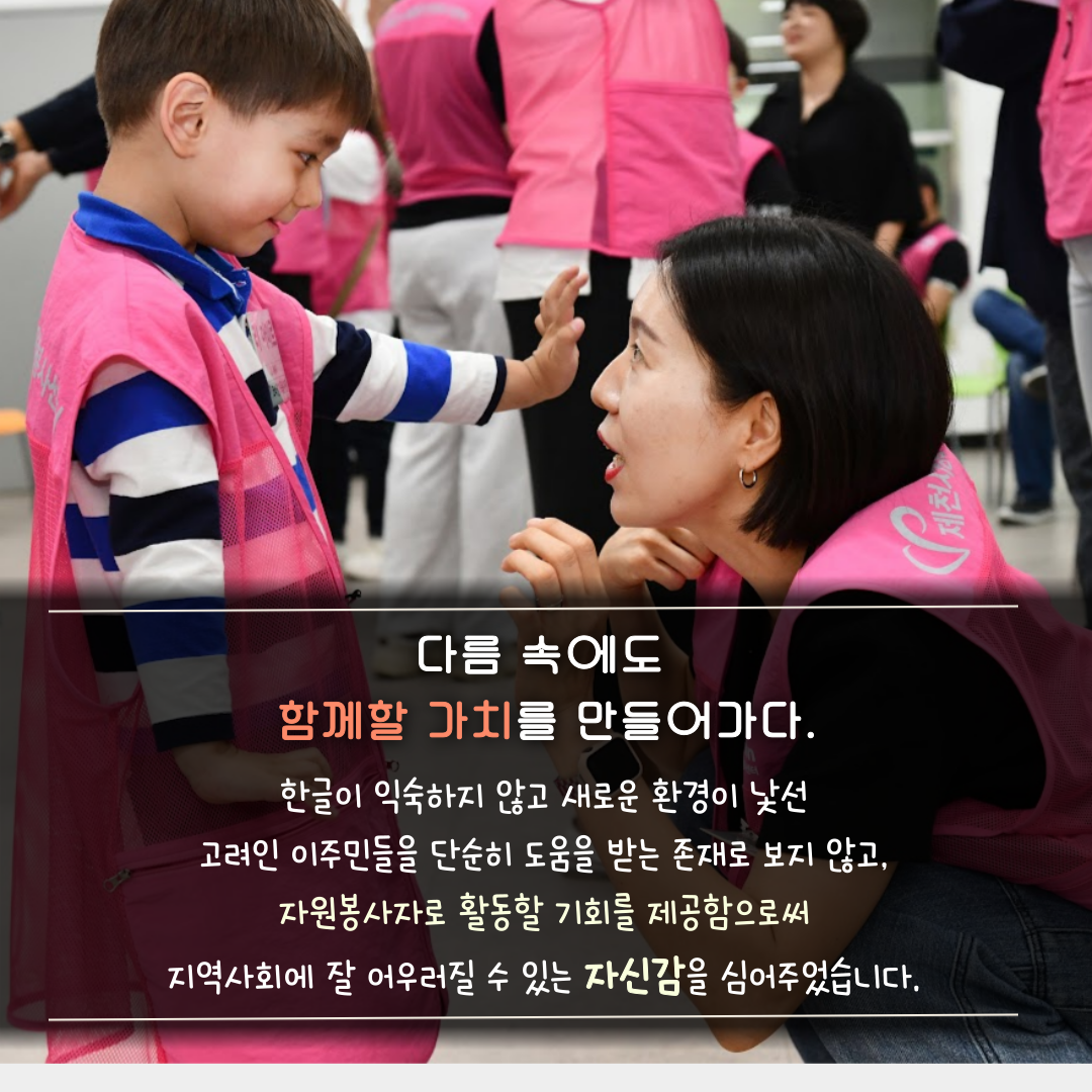 활동사례 [충북 제천시] 고려인 가족과 같이(가치)있는 오늘! 맛있는 자원봉사 관리자 2024.12.17 222 이전글 [충남 태안군] 자원봉사로 하나 되는 이주민 커넥션 플랫폼(관계안내인) 목록 다음글 [경북 의성군] 여행 어때? 봉사 어때! 의성 어때~