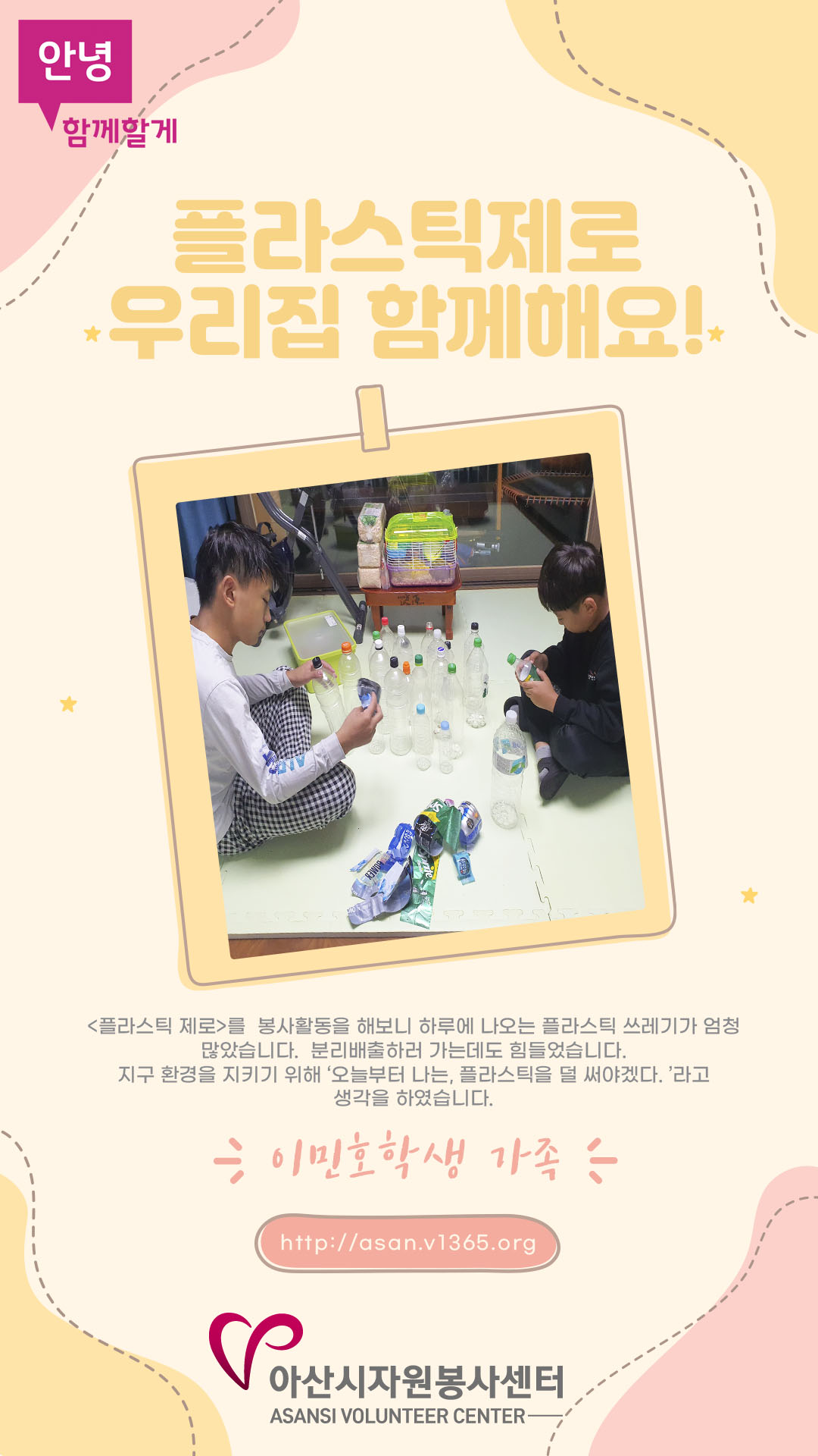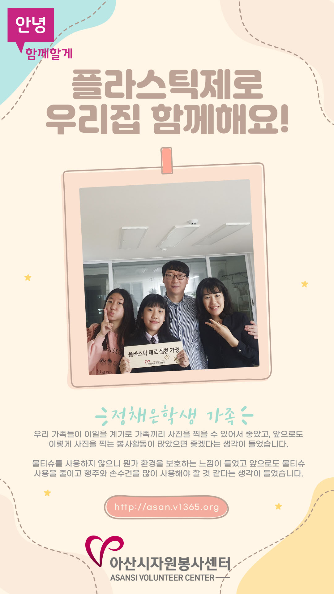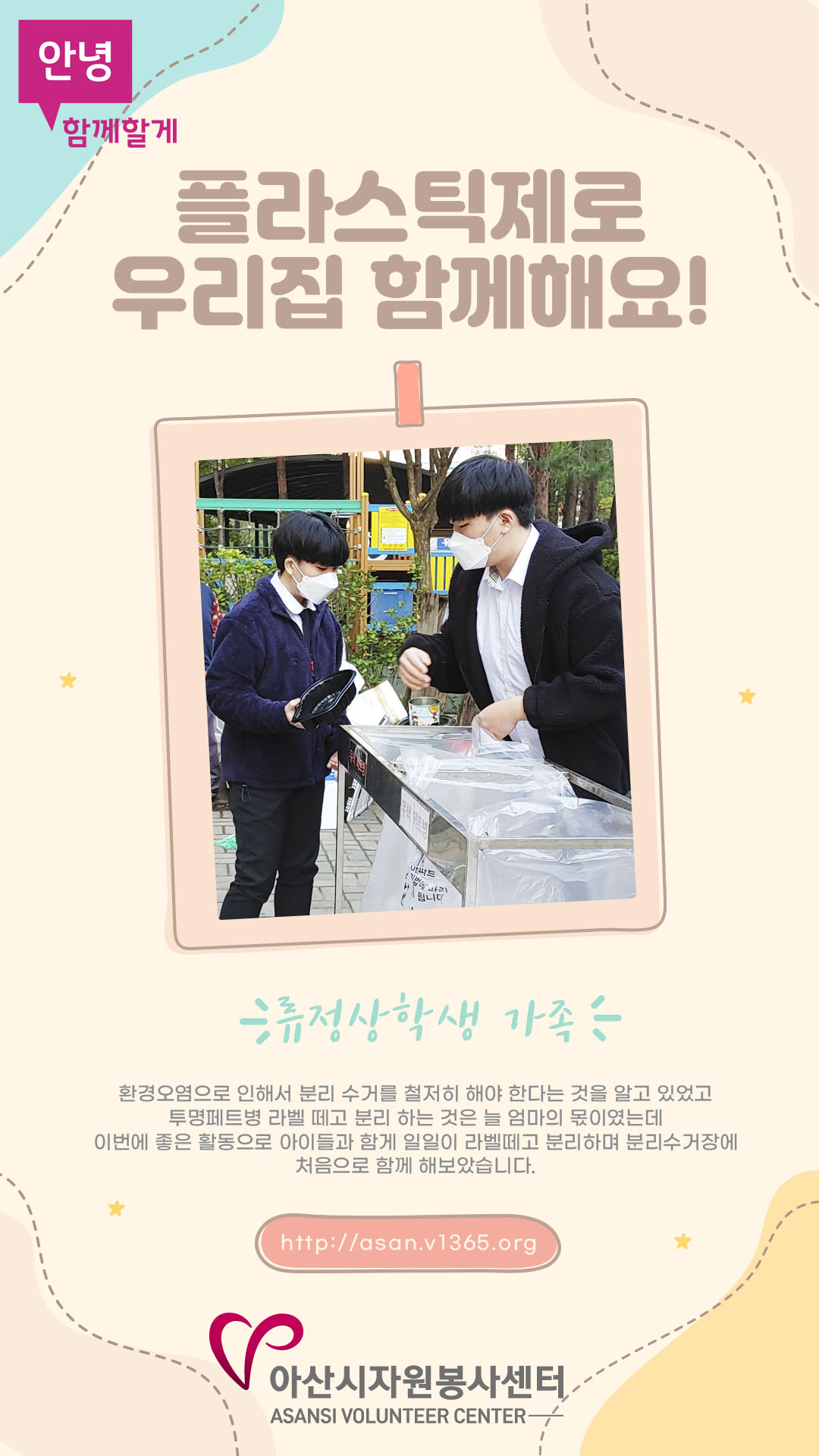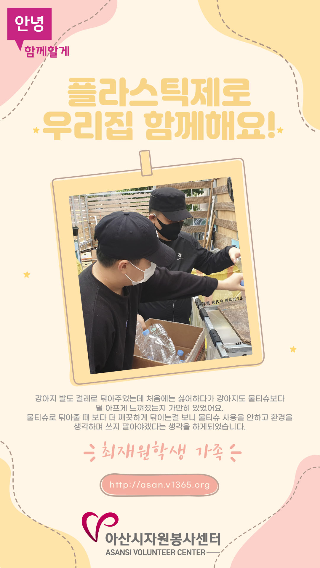 자원봉사자 스토리 [충남 아산시] 플라스틱제로 우리집 함께 해요! 관리자 2021.12.29 1552 플라스틱제로 우리집 함께 해요! 이전글 [충남 아산시] 안녕! 일상 속 작은 실천 클린아산DAY 함께 할게! 피스로드 바이클린팀 목록 다음글 [충남 아산시] 안녕! 일상 속 작은 실천 클린아산DAY 함께 할게! 캠페인