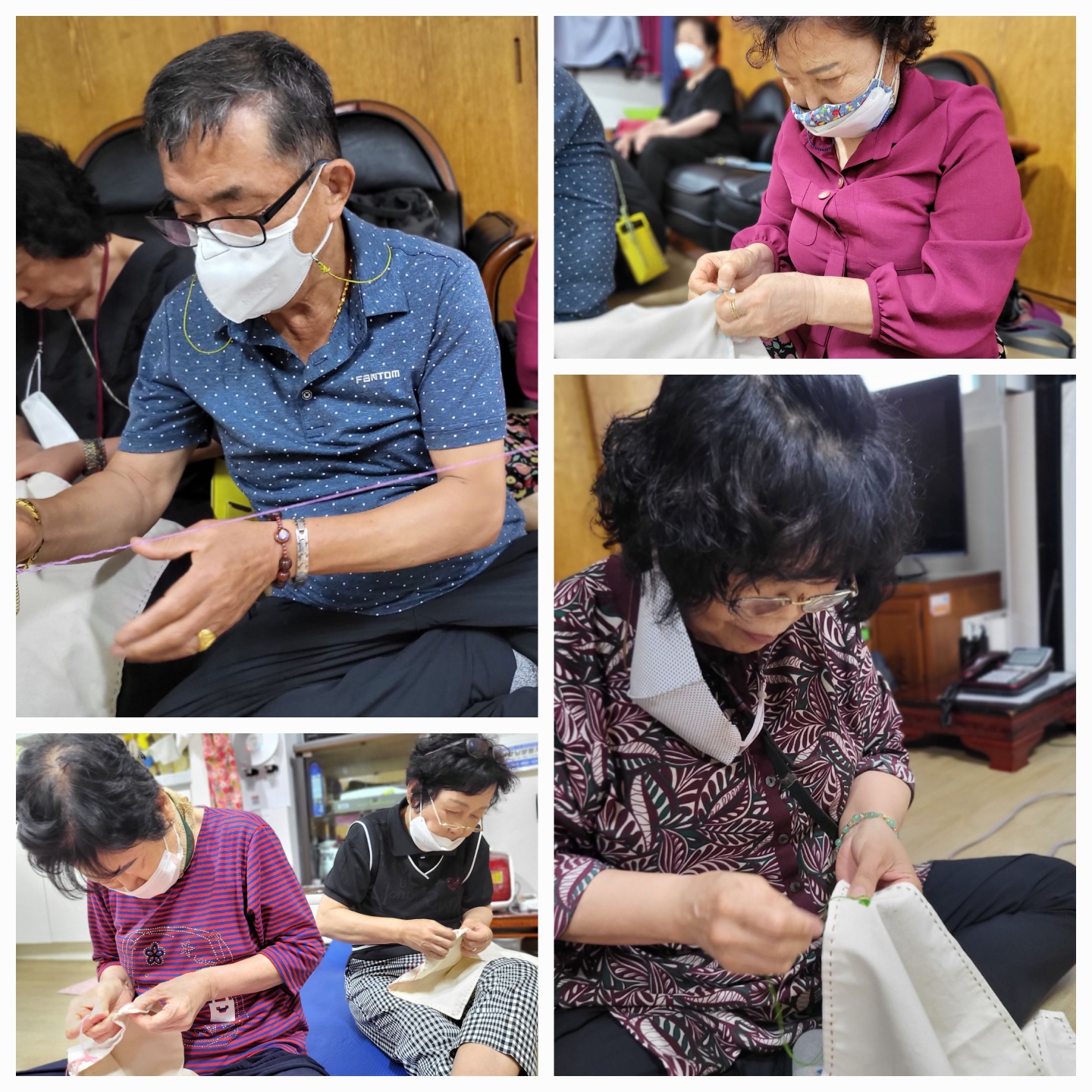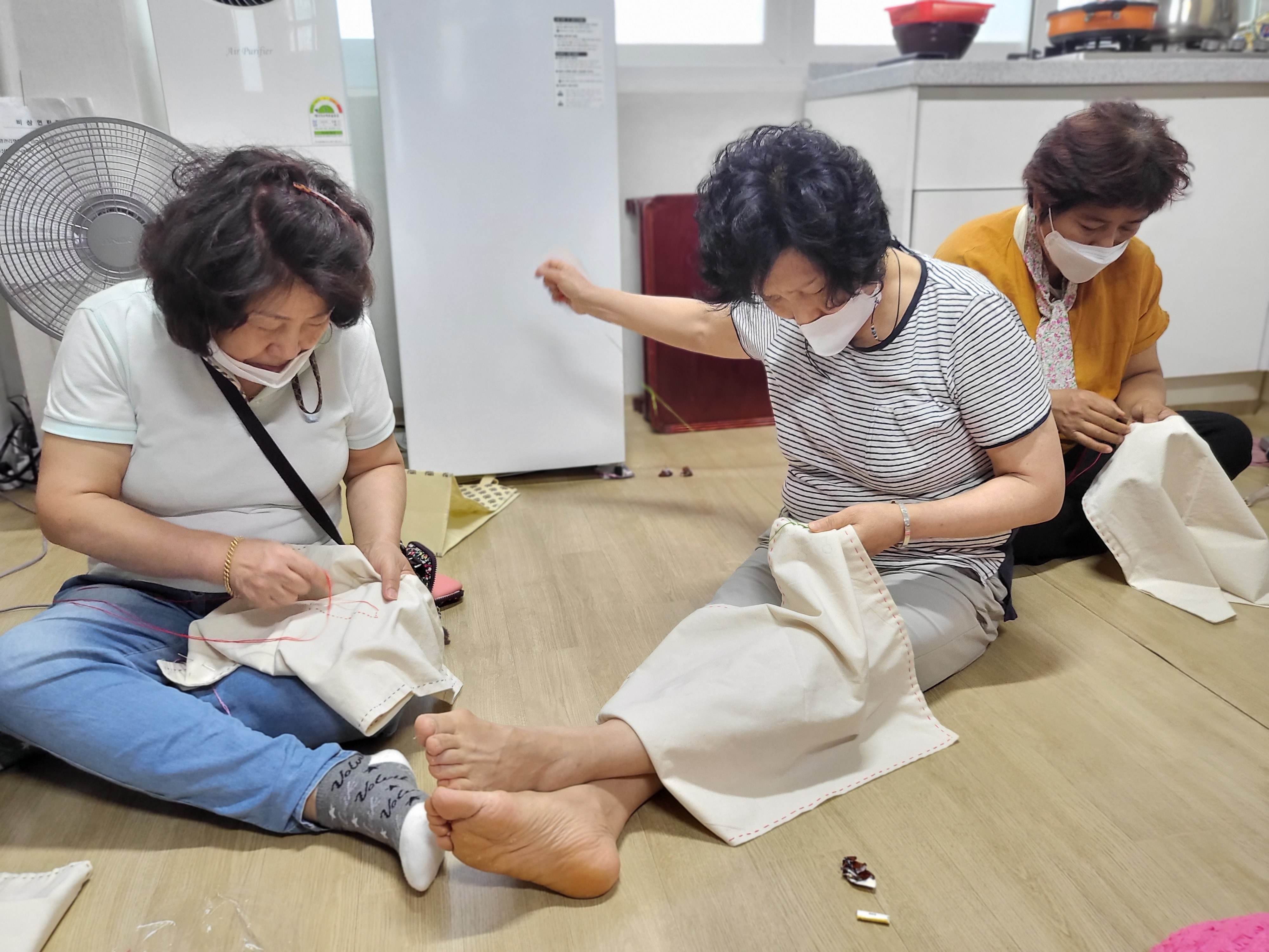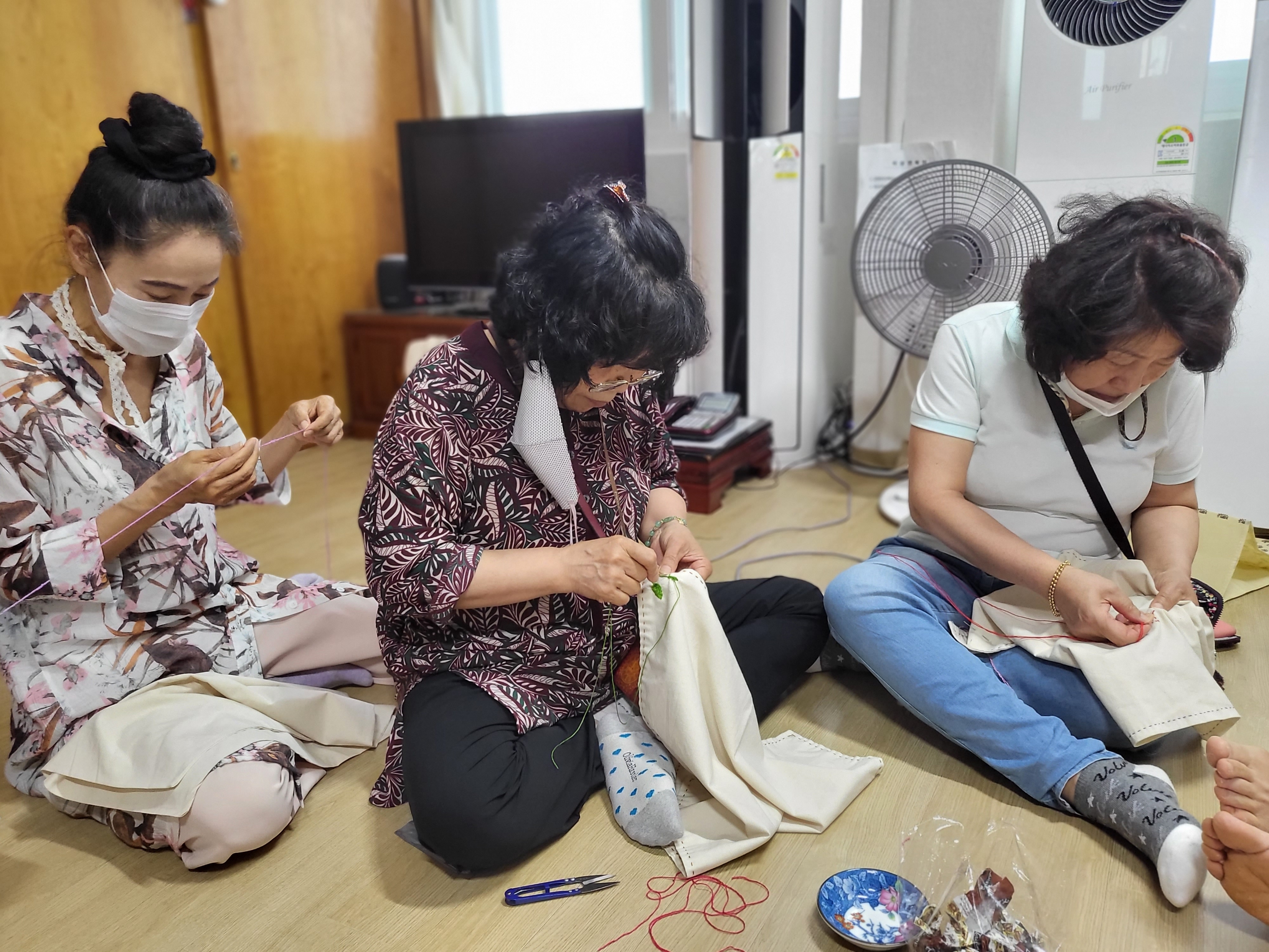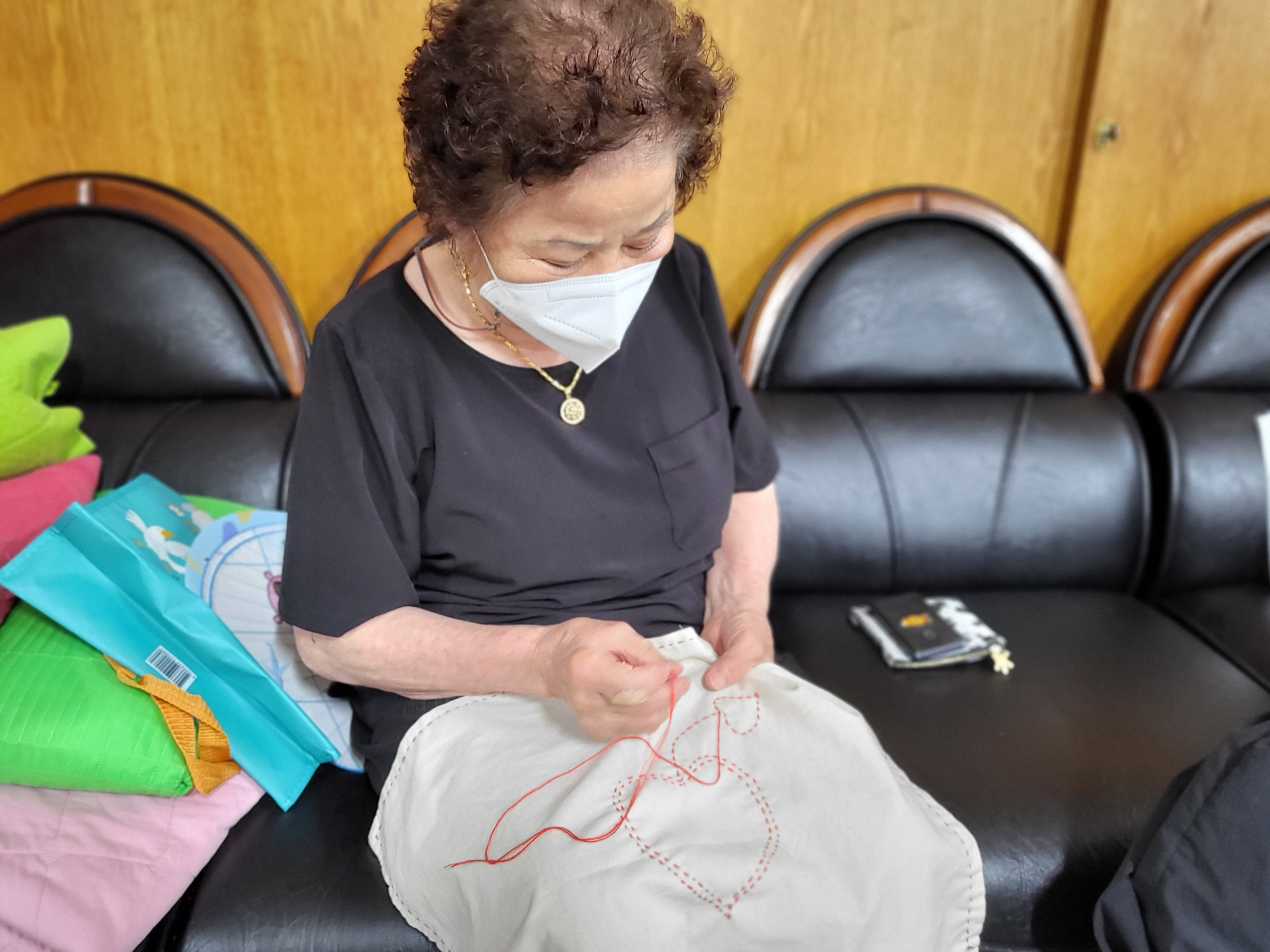 준비한 원단에 어르신들과 함께 손바느질로 수를 놓아