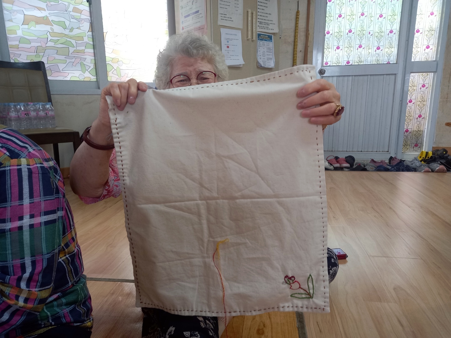 준비한 원단에 어르신들과 함께 손바느질로 수를 놓아