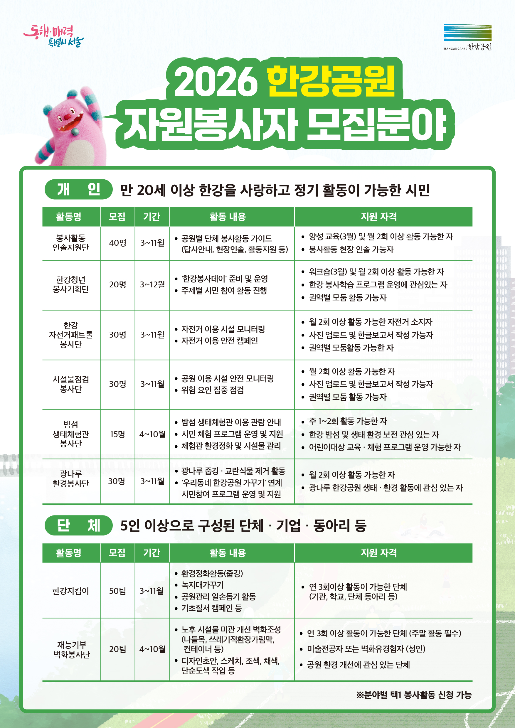 [홍보] 2026 한강공원 자원봉사자 모집 안내
