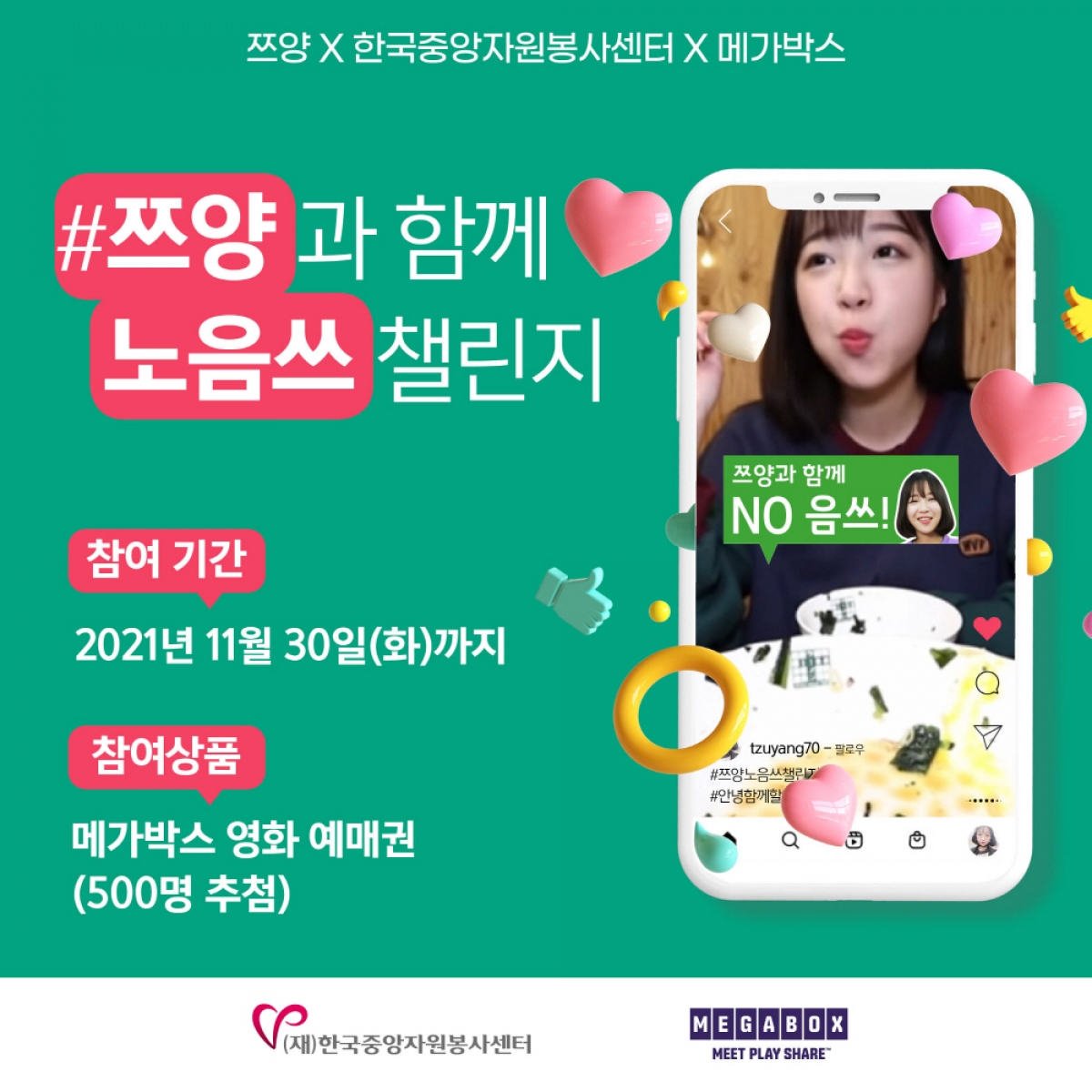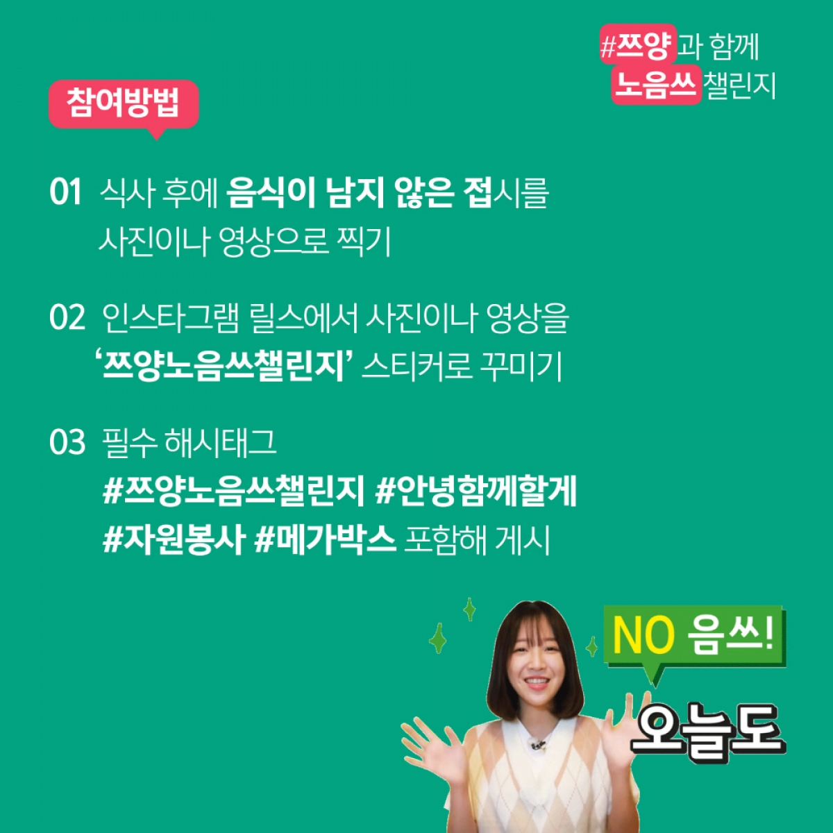 주요행사 [2021] 유튜버 쯔양과 함께하는 NO음쓰 챌린지 2021.11.01 ~ 2021.11.30 한국중앙자원봉사센터 총 1개의 댓글이 있습니다. 하하하핳 2021.11.08 15:55 쓰레기 줍기 이전글 [2022] 안녕! 산해진미 함께할게 이벤트 : 1회차... 목록 다음글 [2021] 안녕! 산해진미 함께할게 3회차 이벤트...