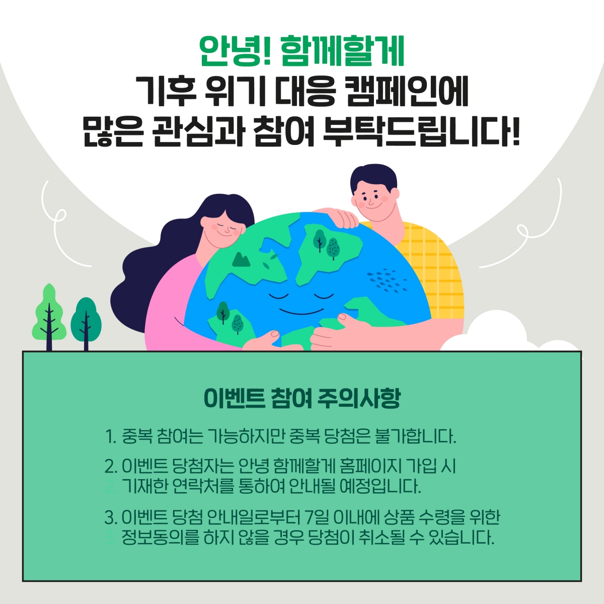 본 이벤트는 안녕 함께할게 홈페이지의 ‘플로깅 코스’ 게시판의 게시물에 코스관련 댓글을 남겨주셔야 참여 완료가 됩니다! 이 점 참고하시어 이벤트 참여를 부탁드립니다 ~