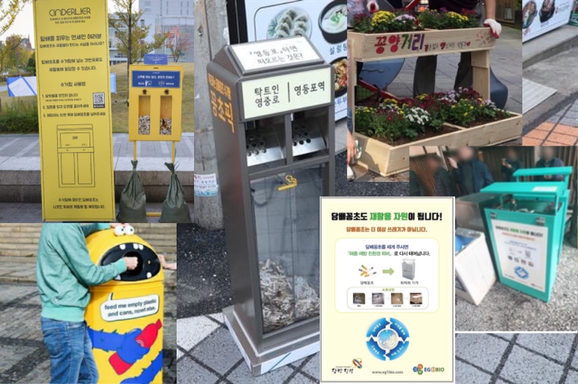 해외, 국내 지자체, 기업 등등 여러 방면으로 담배꽁초를 수거하려는 시도들이 있었어요. 해외에서는 법적으로 무단투기를 막거나, 공사장 보호벽, 공업용 제품 받침대를 100% 재활용 담배꽁초로 제작하는 회사도 나타났답니다. 한국의 한 기업에서도 담배꽁초를 퇴비화 하는 개발에 성공하였고, 서울시 영등포구에서는 담배꽁초로 투표를 할 수 있는 꽁초투표함. '꽁초픽’이 설치되었으며, 당진에서는 퇴비화에 사용될 담배꽁초 수거함을 만들기도 하였죠. 다양한 방법으로 이를 수거하고 재활용하려는 노력이 있었어요.