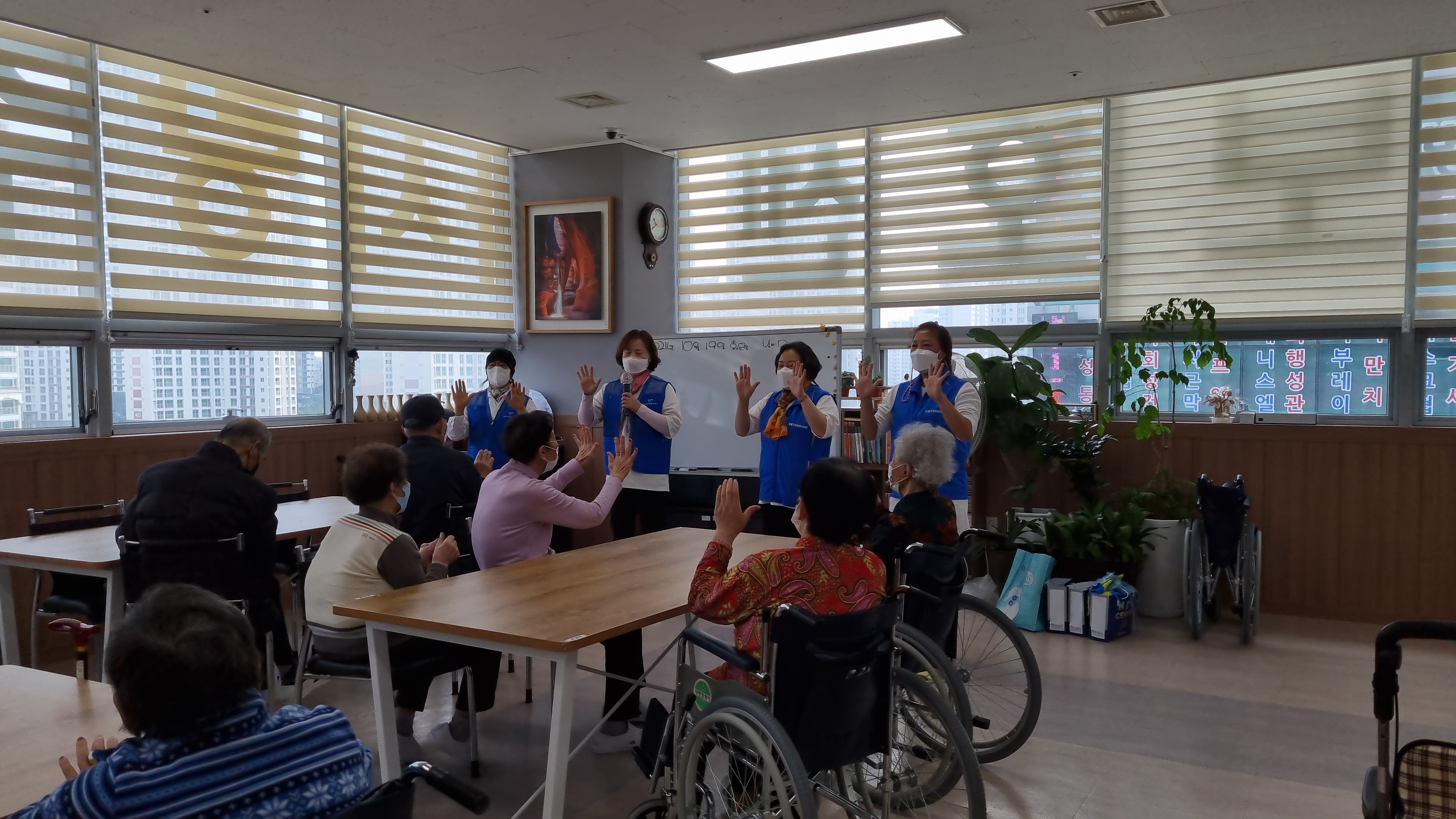 저희 건강체조봉사단은 지역내의 경로당, 요양원들을 방문하여 어르신들과 함께 멋진 트로트 가락에 맞추어