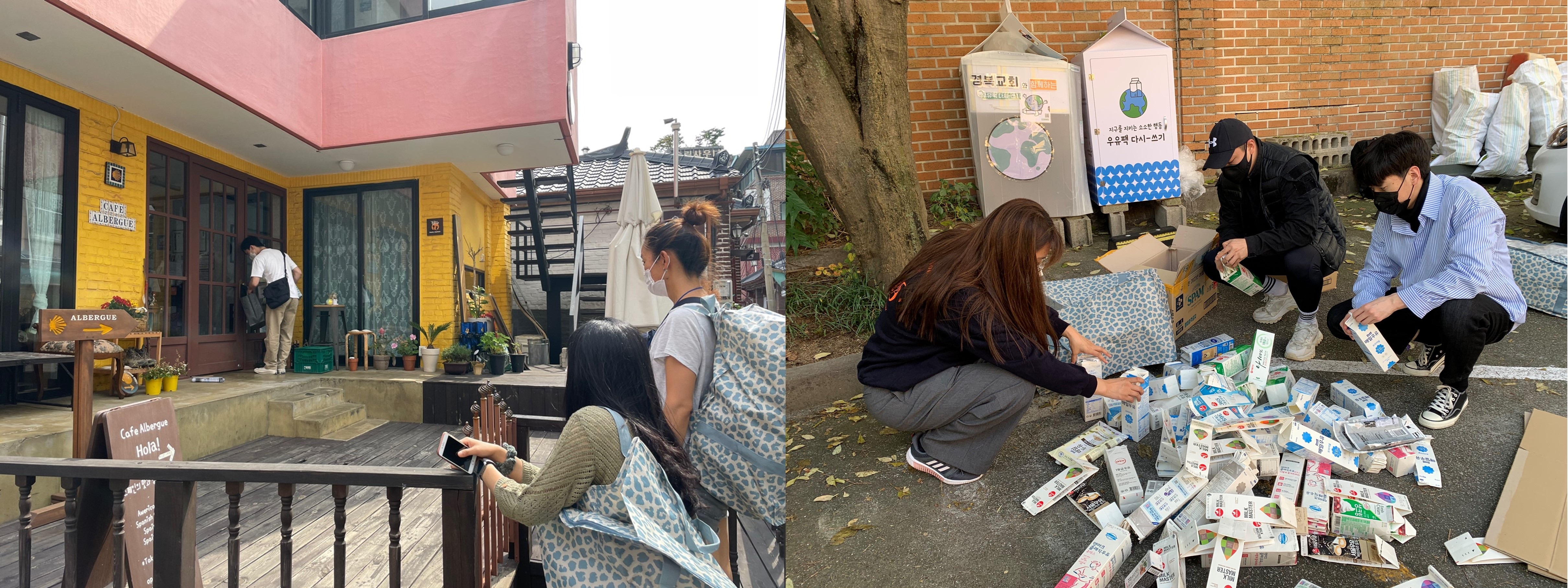 예쁜 카페들이 많이 모여 있는 서울 서촌(경복궁역 인근) 지역에서 우유팩 다시-쓰기 ‘지구봉사단’ 1기(6/21~8/20), 2기(9/6~11/5)가 수거 봉사에 나섰습니다. 월요일부터 금요일까지 서촌 25개 카페에서 우유팩 수거가방에 깨끗이 씻어서 말린 우유팩을 담아 내어 줍니다. 그러면 지구봉사단의 정해진 요일 담당 봉사자(2-3명)가 카페를 돌며 우유팩을 수거하여 정해진 장소에 정리해놓는 활동입니다. 이렇게 모아진 우유팩은 <사회적협동조합 자원과순환> 수거 차량을 통해 재활용집하장으로, 이 곳에서 다시 <동방제지>로 보내져 화장지로 재탄생 되고 있습니다.