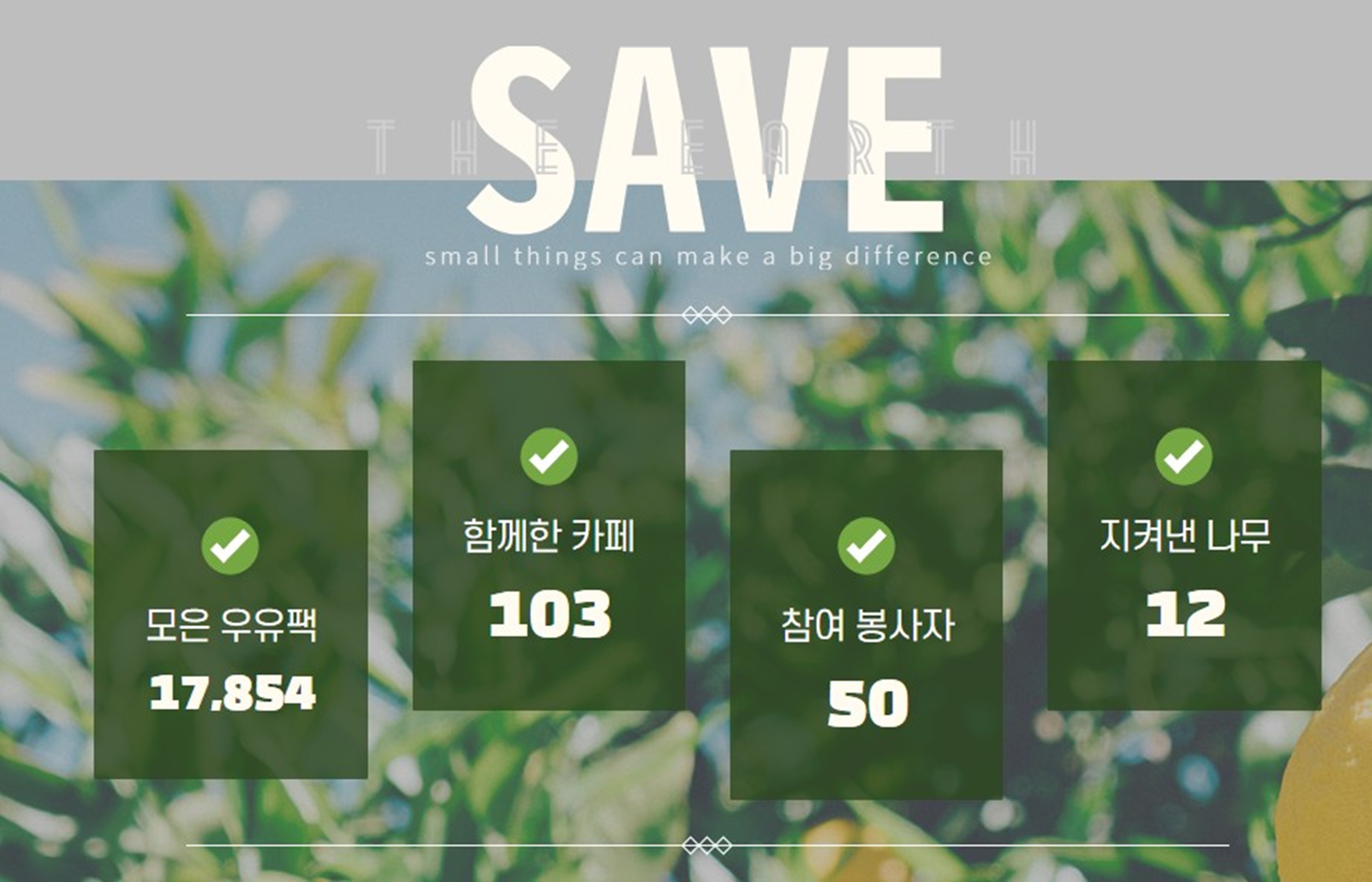 우리나라의 종이팩(우유팩) 재활용률은 2020년 16%로 다른 나라에 비해서도, 다른 품목에 비해서도 현저히 낮습니다. 특히 카페에서 카페라떼, 밀크티 용으로 많이 발생하는데, 자원봉사를 통해 이를 수거하여 재활용률을 높이고자 합니다. 서울 서촌에서 시작한 이 작은 행동은 서울 필동, 방배동, 고양 일산, 태백, 양평, 춘천 등으로 퍼져나가기 시작했습니다. 우유팩 1,500개를 잘 모으면 30년생 나무 한 그루를 지키는 셈입니다. 몇 그루까지 지켜낼 수 있을까요?