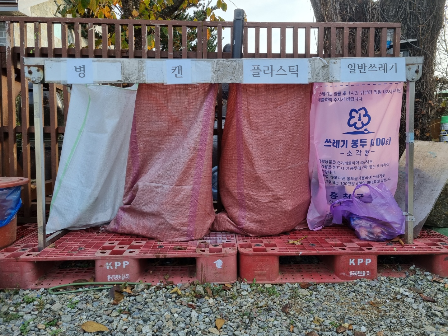 도시에서는 각 아파트나 주택가마다 분리수거장이 설치되어 있지만, 아쉽게도 시골마을에서는 지역주민들이 분리수거장을 직접 설치한 것을 보지 못했습니다.