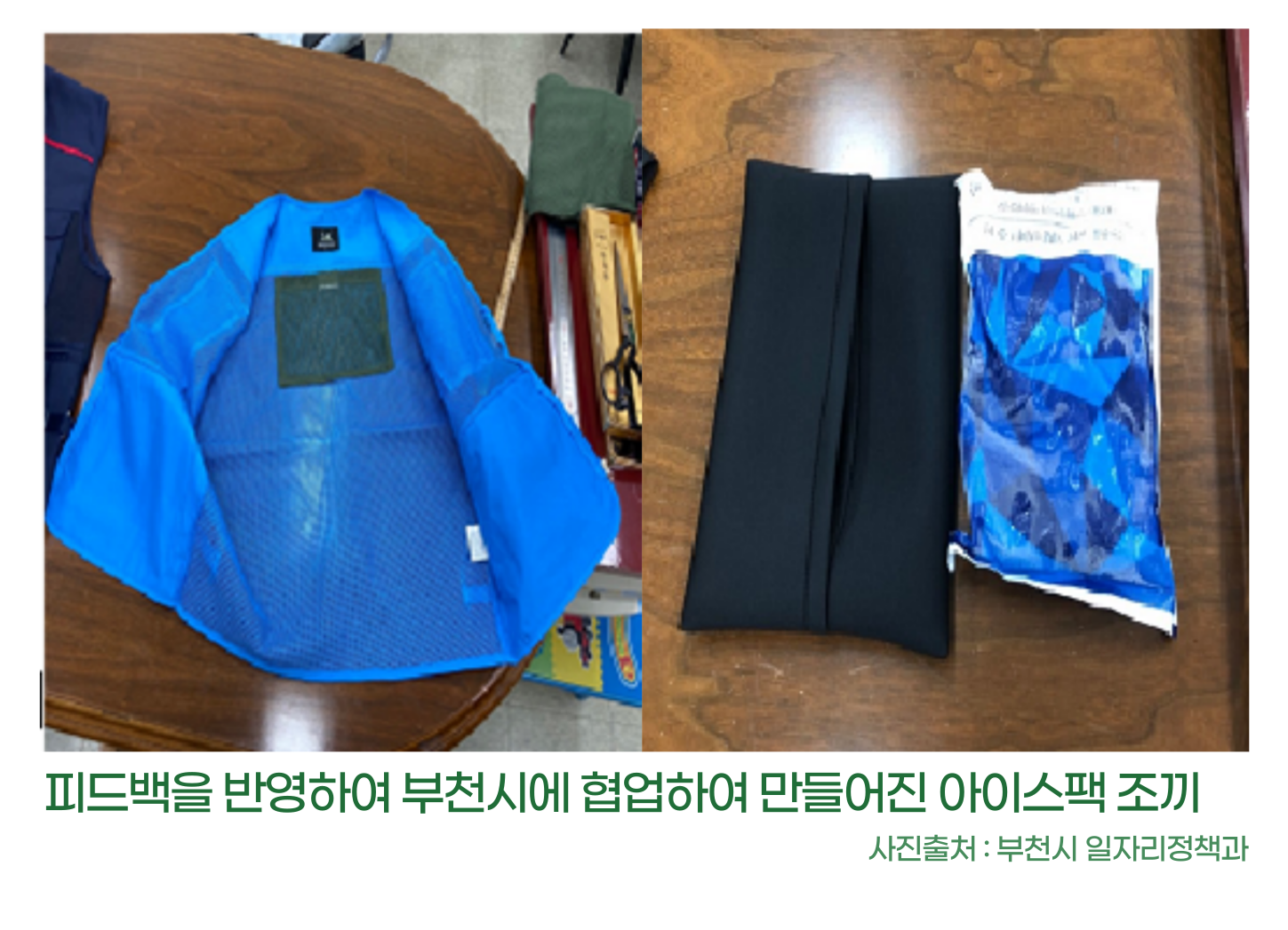 해당 아이스조끼 아이디어는 현재 부천시에서 시행하고 있다. 아이스조끼 제작부터 운반과정까지 부천시의 공공일자리인력을 통해 이루어지고 있다. 무더위에 지친 사람들을 도와주면서도 직접 일자리 창출이란 결과에 도출 할 수 있었다.