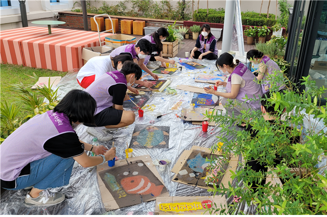 PE망과 폐박스에 하나하나 동국대 페인터즈 학생들이 정성을 들여 만들어주어서 완성하는 데 많은 시간이 걸렸습니다. 하나를 색칠하고 말리고 벗겨지지 않도록 보존제를 덧칠해야 하니 상당한 시간이 걸렸습니다. 단기간 빠르게 진행할 수 있는 캠페인은 아니라고 생각했습니다.