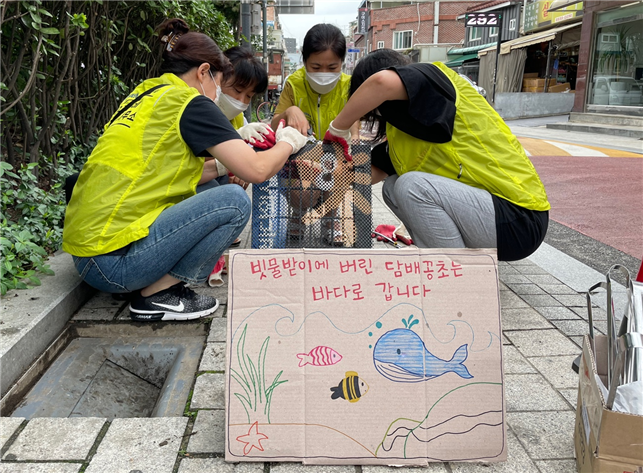 다른 센터들의 사례들을 찾아보고 공부하다보니 과연 그림만 그린다고 캠페인 메시지를 제대로 전달할 수 있을까 의문이 들었고 더 나은 방법을 찾던 중 담배꽁초를 실제로 거를 수 있는 PE망을 사용해 임팩트 있는 그림과 메시지를 넣어 설치하게 되었습니다. 동국대 벽화동아리 페인터즈와 함께 진행한 중구형 바다의 시작은 가시적인 효과와 더불어 다른 캠페인과의 연계도 활발히 진행되고 있는 현재 진행형 캠페인입니다.