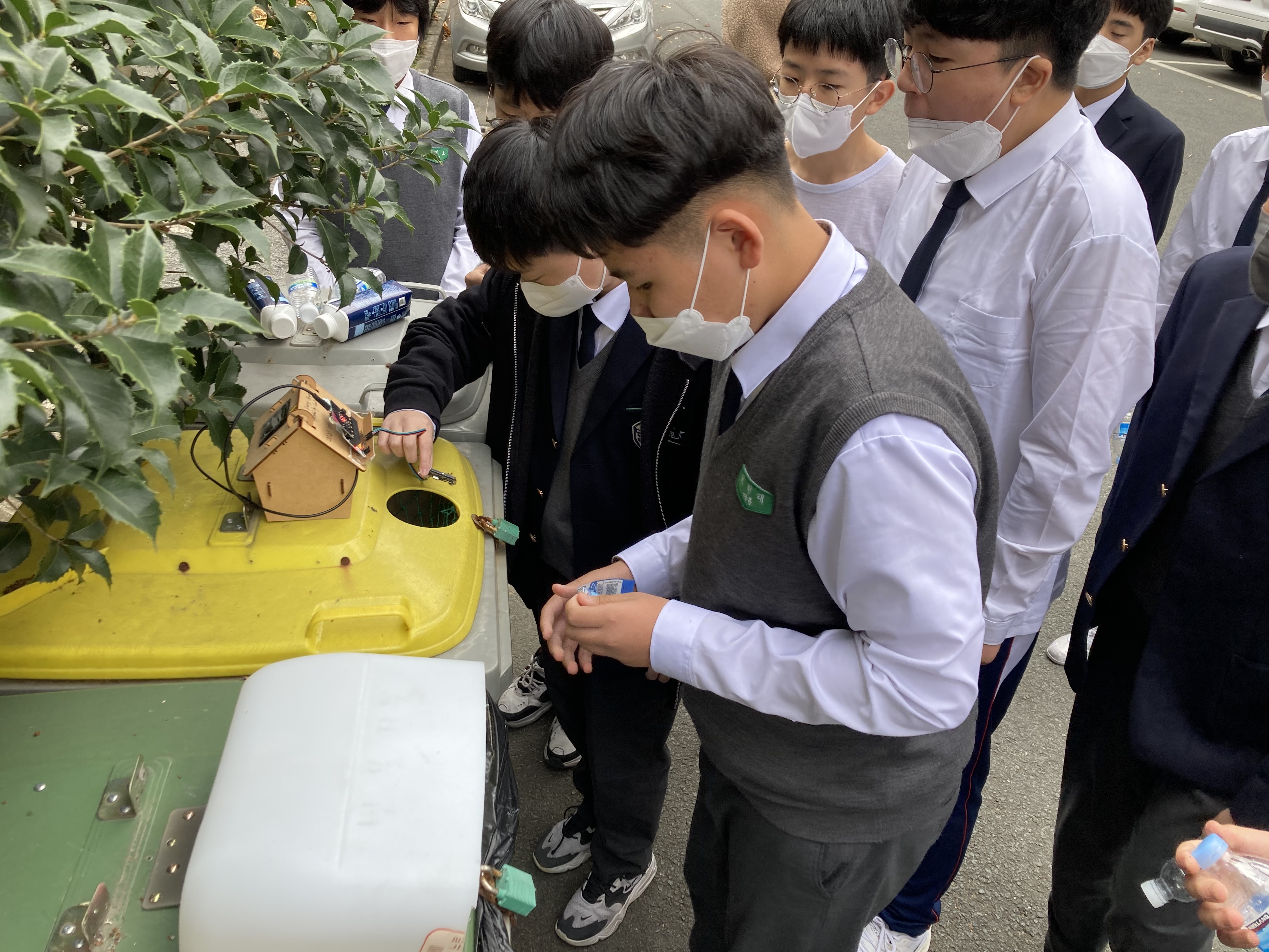학생들의 투명페트병 분리배출을 돕기 위해 "투명페트병 인식 장치"를 개발하여 학교에 적용하였습니다.