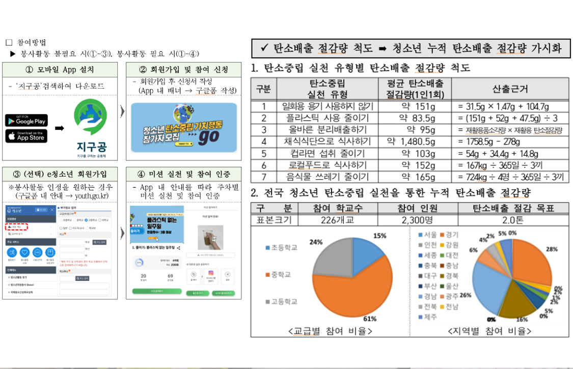 국립청소년농생명센터는 청소년의 환경감수성 증진이 탄소중립사회의 근간으로 이어질 수 있도록 전국 213개 초중고교 2,300여 명의 청소년들과 함께 하는 탄소중립 가치 행동을 시작하였습니다. 본 활동은 총 5주간 실생활에서의 탄소중립 실천을 모바일 어플리케이션(지구공)을 통해 인증하고 교류하는 방식으로 진행됩니다.