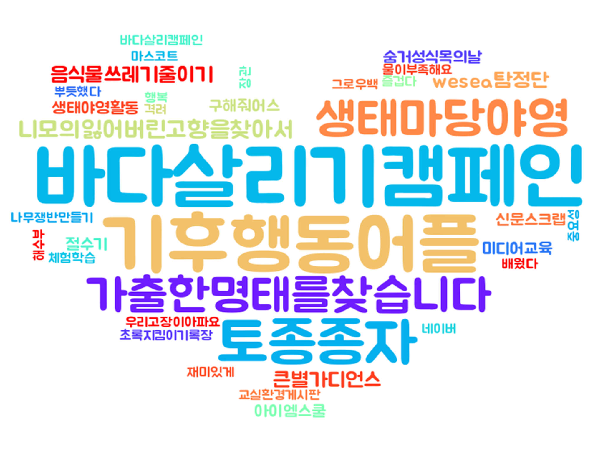 학생들의 환경에 대한 생각 변화에 큰 영향을 준 프로그램을 묻는 질문에 대부분의 학생들이 ‘바다 살리기 캠페인’으로 답하였습니다. ‘우리 고장 바다를 생각하는 계기가 된 것 같다’, ‘지역 사회의 관심과 격려를 받아 뿌듯했다’, ‘해수부 장관님이 영상편지와 마스코트도 받고 네이버와 인터넷에 우리 소식이 올라가서 자랑스러웠다.’ 등과 같은 의견들이 제시되어 바다살리기 캠페인이 학생들의 환경에 대한 의식 및 태도에 가장 긍정적인 변화를 이끌어 내었다고 생각되었습니다. 더불어 학부모들의 의견 중에서도 ‘아이와 바다 쓰레기를 주우면서 쓰레기가 너무 많은 걸 보고 환경에 대해 다시 생각하게 되었고 본인 스스로가 지켜야 한다고 생각이 바뀌자 부끄럽기도 하고 이런 교육이 지속되면 좋겠다는 생각이 듭니다.’와 같은 의견에서 학부모와 함께한 바다살리기 캠페인이 환경에 대한 학부모의 인식 변화에도 긍정적인 영향을 주었으며, 이러한 결과는 가정에서의 환경사랑 실천 동참을 이끌어 낼 수 있으리라 기대합니다.