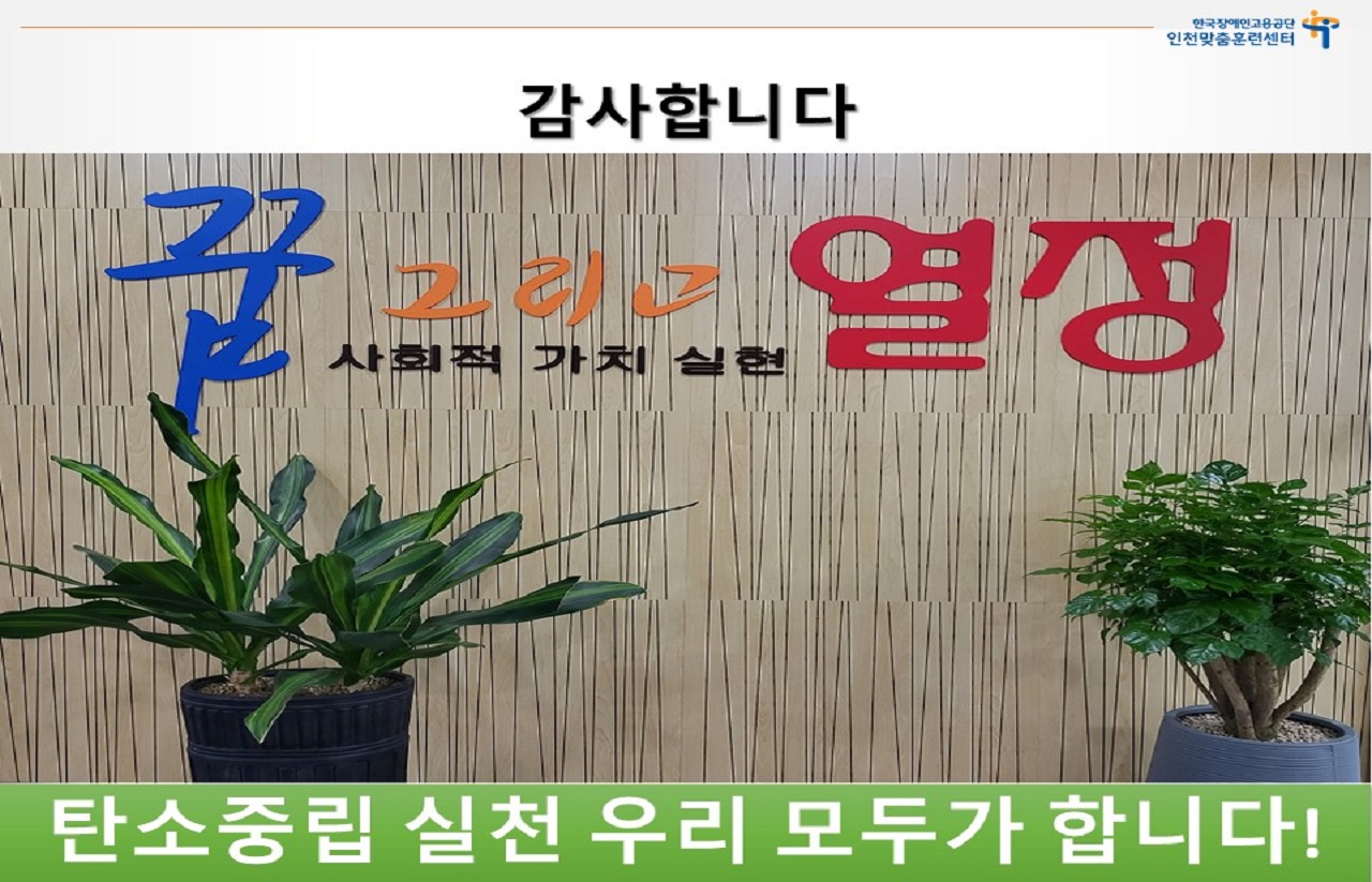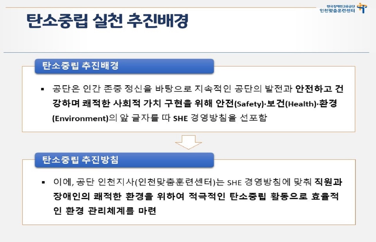 센터는 SHE 경영방침에 맞춰 환경에 대한 사회적 가치를 책임지기 위해 적극적인 탄소중립 활동으로 효율적인 환경 관리체계를 마련하여 직원과 장애인의 쾌적한 환경을 만들었습니다.