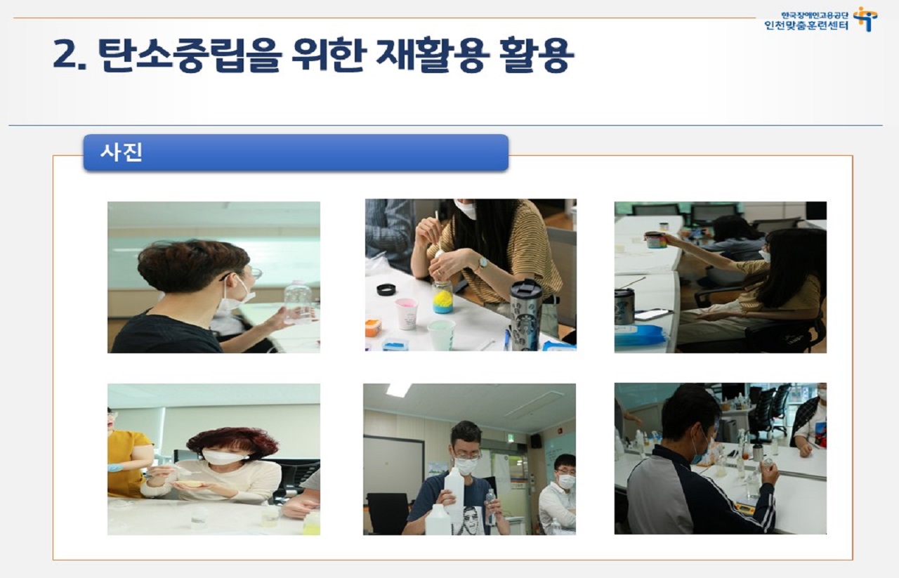이에 센터에서는 장애인학생에게 탄소중립 교육, 재활용품 활용, 물품기부 등을 실시하여 장애인학생의 탄소중립 생활화를 통해 장애인학생이 취업 후 기업에서 탄소중립 전파자가 될 수 있도록 하고 있습니다.