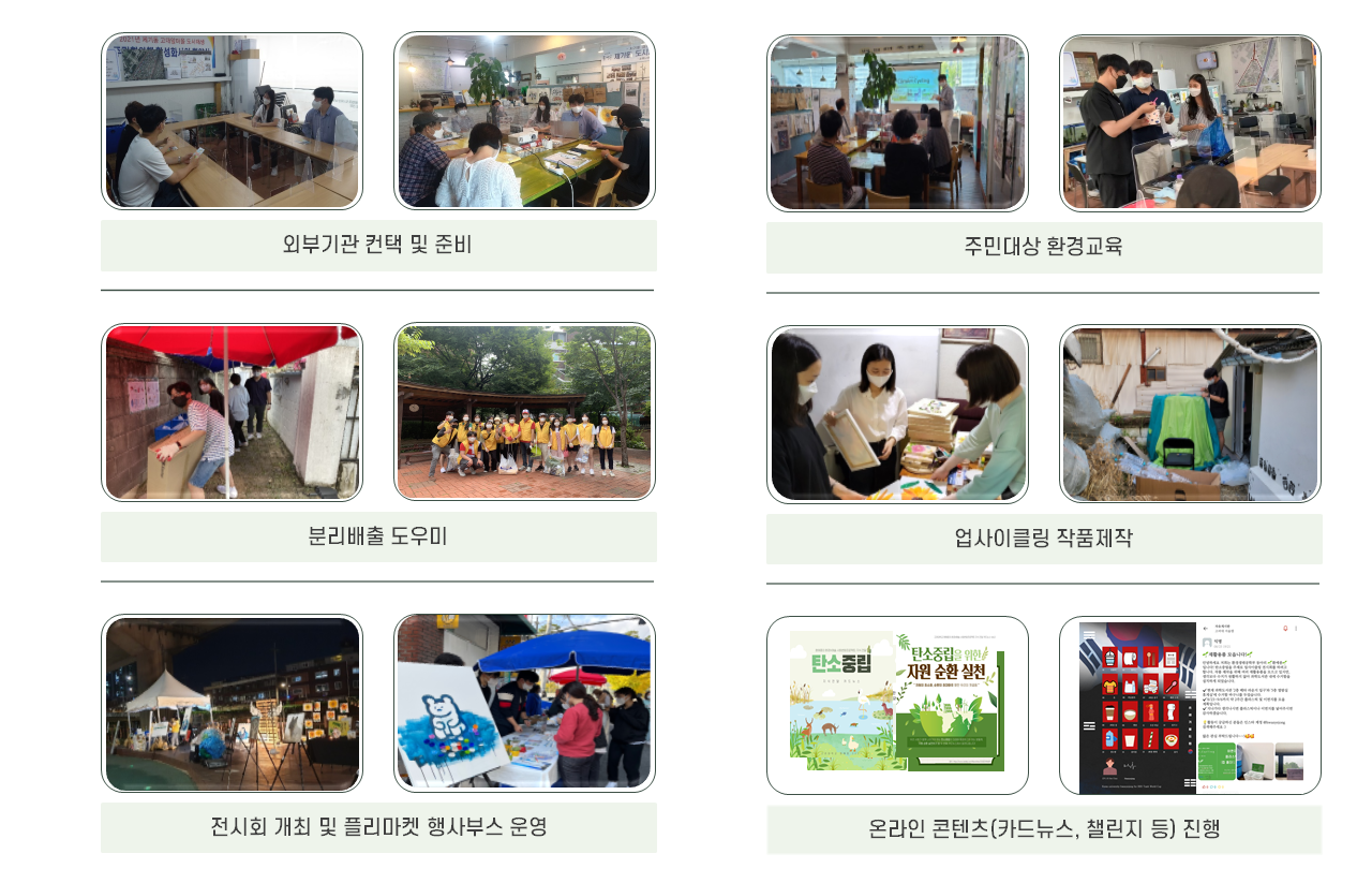 단순한 환경교육 프로그램에 대하여 귀찮음을 느끼시는 분들이 처음에는 많았습니다. 하지만 주민친화적인 교육을 위해 직접 분리배출을 돕고 마을환경을 청소하고 정비하는 활동을 병행하면서 주민협의체 주민들과 신뢰를 쌓으며 활동을 진행하였고 처음에는 잘 모르고 어려워 하시던 분리배출과 탄소중립에 대한 이야기도 환경교육 프로그램에 참여하시면서 관심을 가져 주셨습니다. 또한 교육뿐만 아니라 업사이클링 체험 프로그램을 함께 진행하면서 폐기물로 직접 작품을 만들어보고 다양한 친환경 굿즈를 제공하여 환경 보호와 탄소중립, 자원순환, 분리배출에 대한 부정적인 시각을 해소할 수 있었습니다.