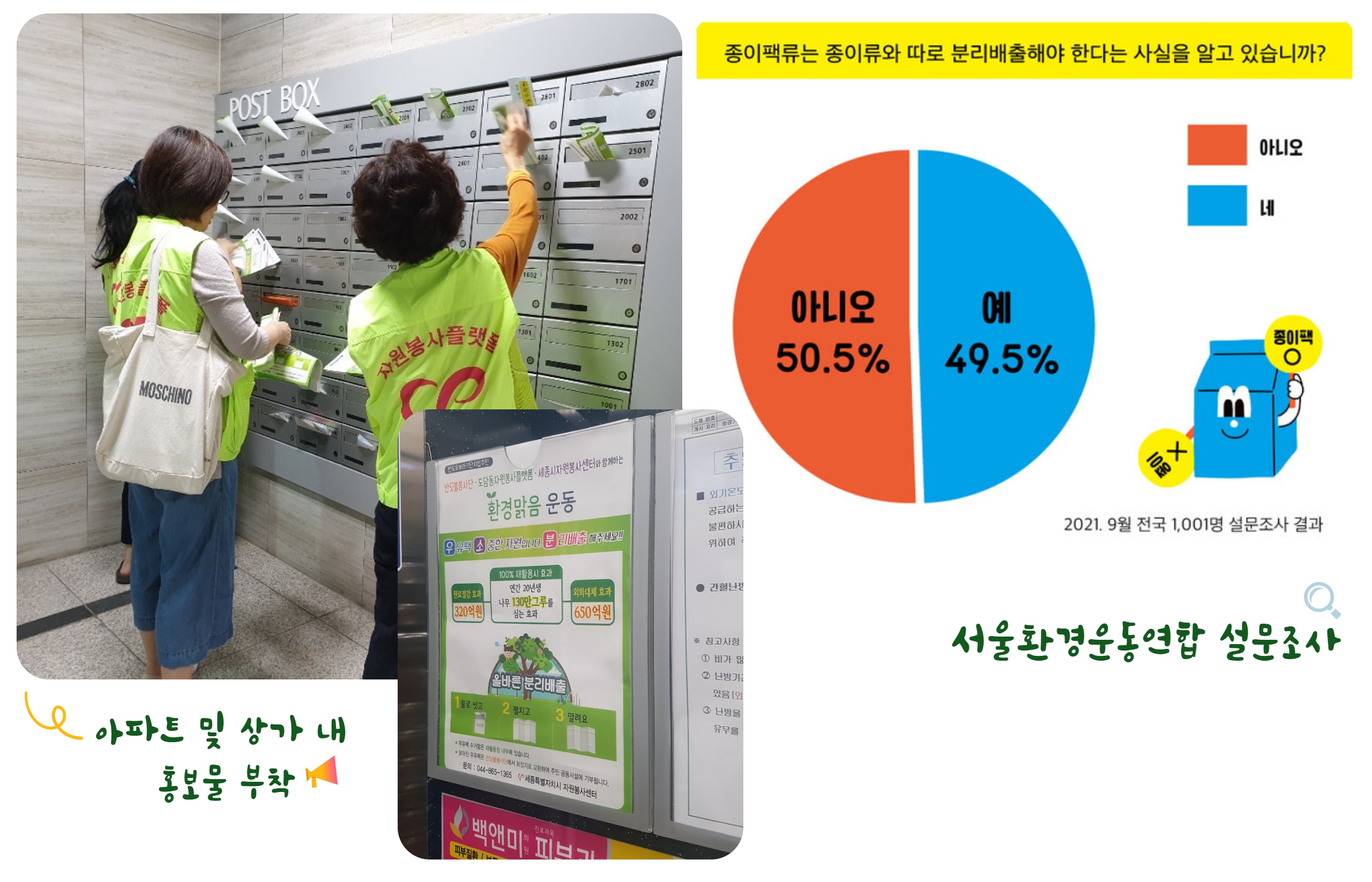 서울환경운동연합이 시민 1001명을 대상으로 설문 조사한 결과에 따르면, 설문 참여자의 50.5%는 종이팩류를 종이와 따로 분리배출 해야 한다는 사실을 몰랐다고 답했습니다. 이렇게 설문조사 하나만으로 우유팩을 종이와 구분해 따로 ‘종이팩’으로 분리배출 해야 한다는 사실을 알고 있는 시민은 많지 않다는 걸 알게 되었습니다. 가족이나 주변 지인들에게만 물어봐도 불편함 때문에, 안내 받지 못해서 등의 이유였습니다.