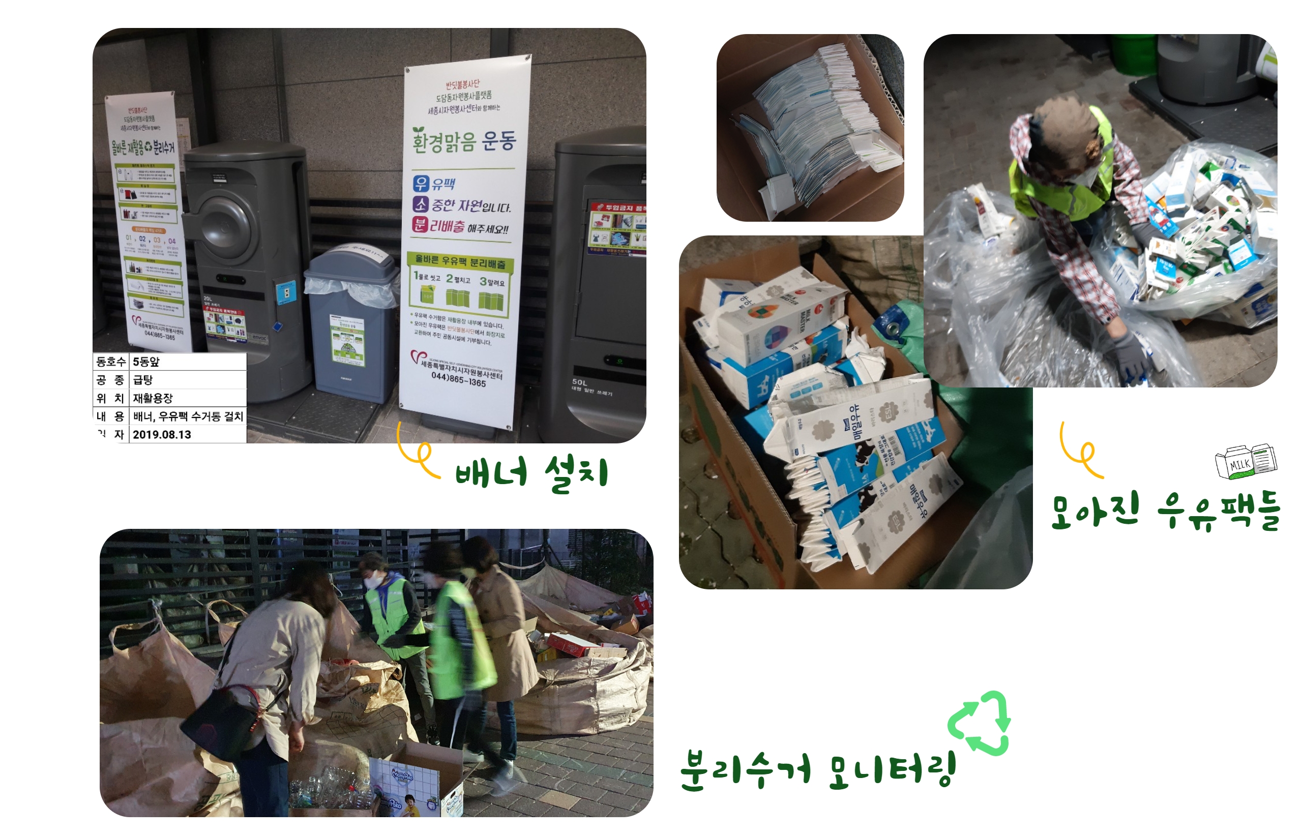 - 2019년부터 주 2회 2인 1조로 팀을 나누어 분리수거장에서 우유팩을 따로 분류하고 세척하여 깨끗하게 모으는 활동을 진행 중입니다. 우유팩 분리방법을 배너로 만들어 수거함 옆에 세워두고 인식을 변화시키고 있습니다.