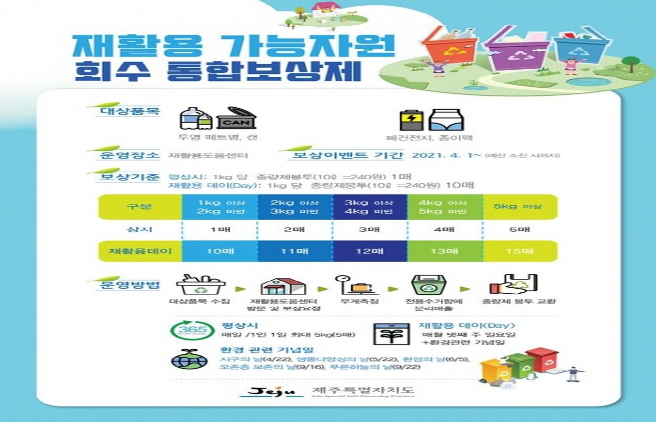제주특별자치도에서는 ‘재활용 가능 자원 회수 보상제’를 시행하고 있습니다.