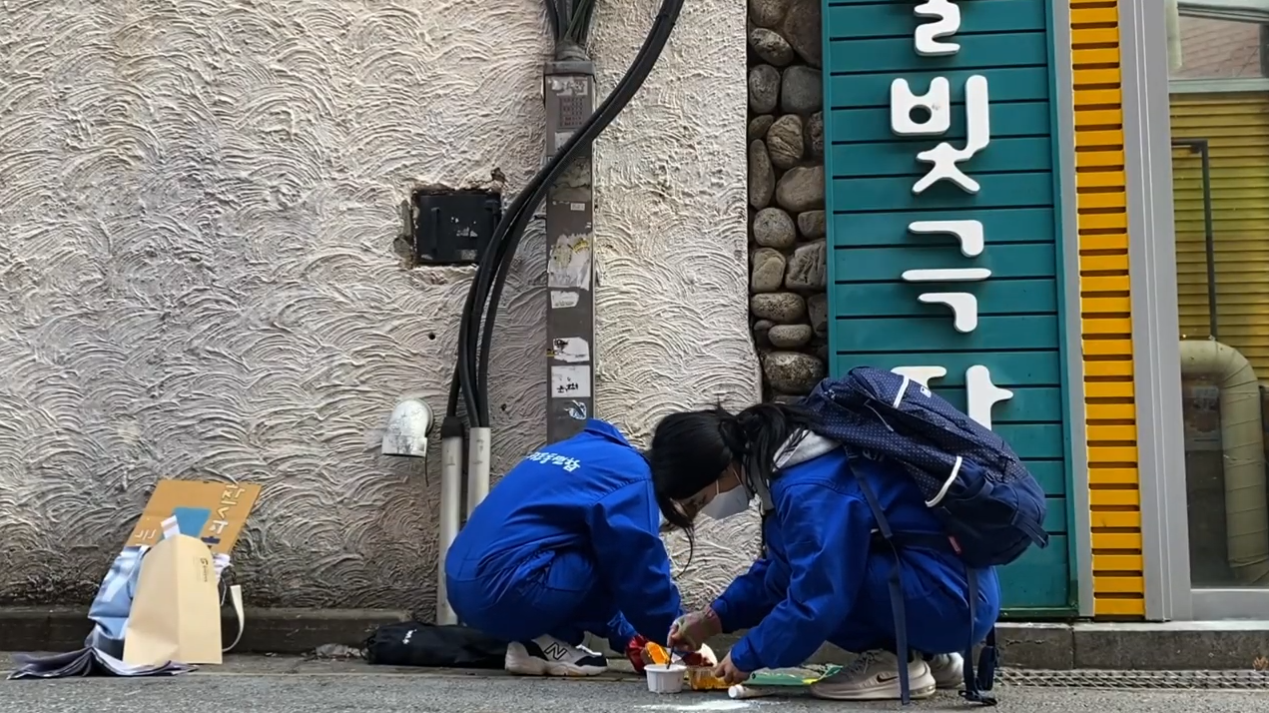 사람들이 지나다니는 보도나 차들이 다니는 도로에서 활동을 해야하다보니 최대한 빠른 시간 내에 페인팅 작업을 마무리하기 위해 스텐실 본을 이용해 활동을 진행했는데요.