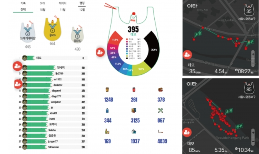 쓰레기를 많이 주운 순으로 참여자들이 랭킹화 되는 시스템을 넣어놓은 것이죠, 실제로 참여자 중 일부는 상위 등급에 도달하려고 미션을 클리어하는 식의 게임처럼 받아들이는 분들도 계셨어요