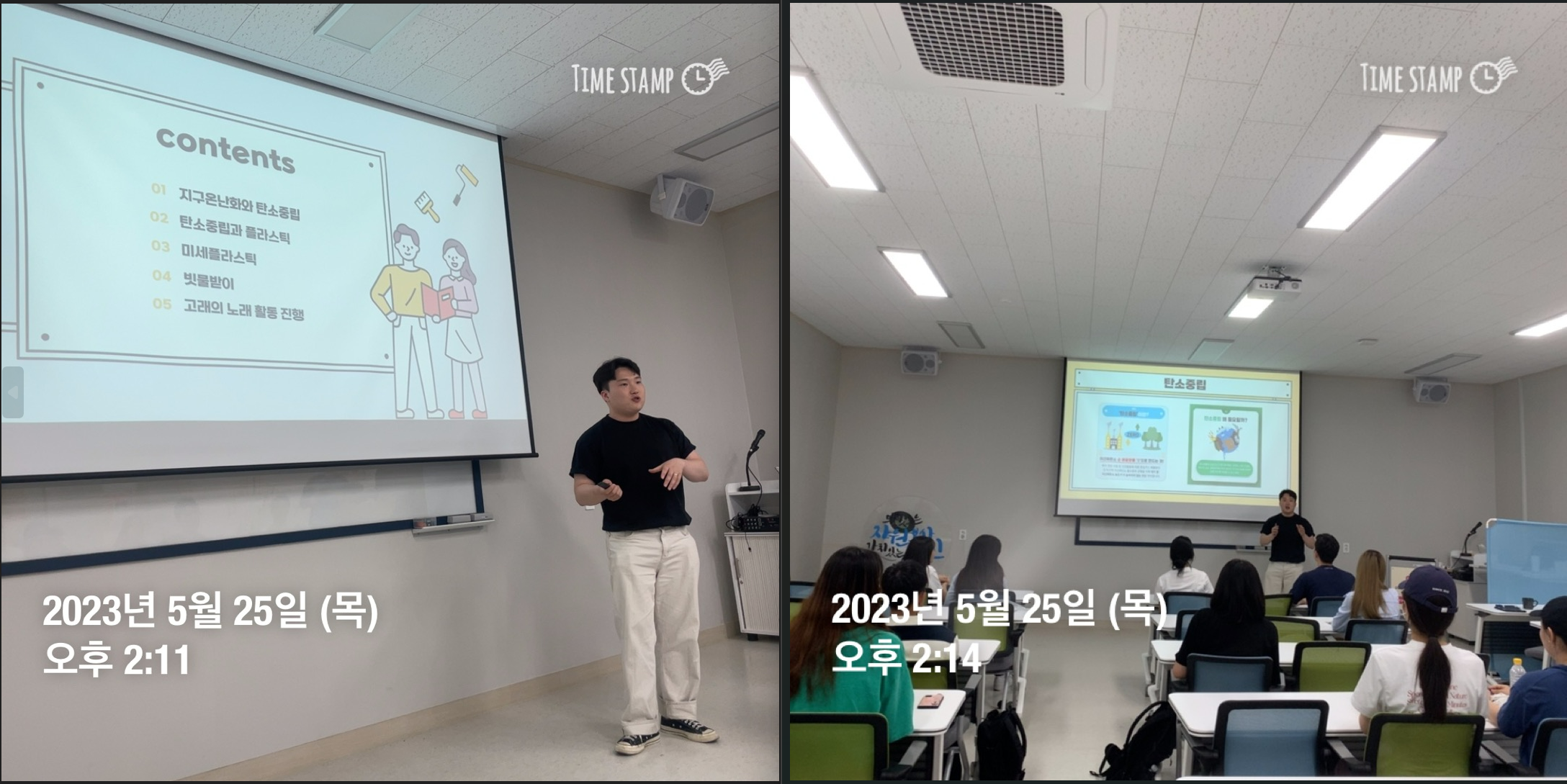 탄소중립의 교육 내용으로는 ‘지구온난화와 탄소중립’, ‘미세플라스틱과 해양오염’, ‘빗물받이’ 등을 선별하여 진행하였습니다.