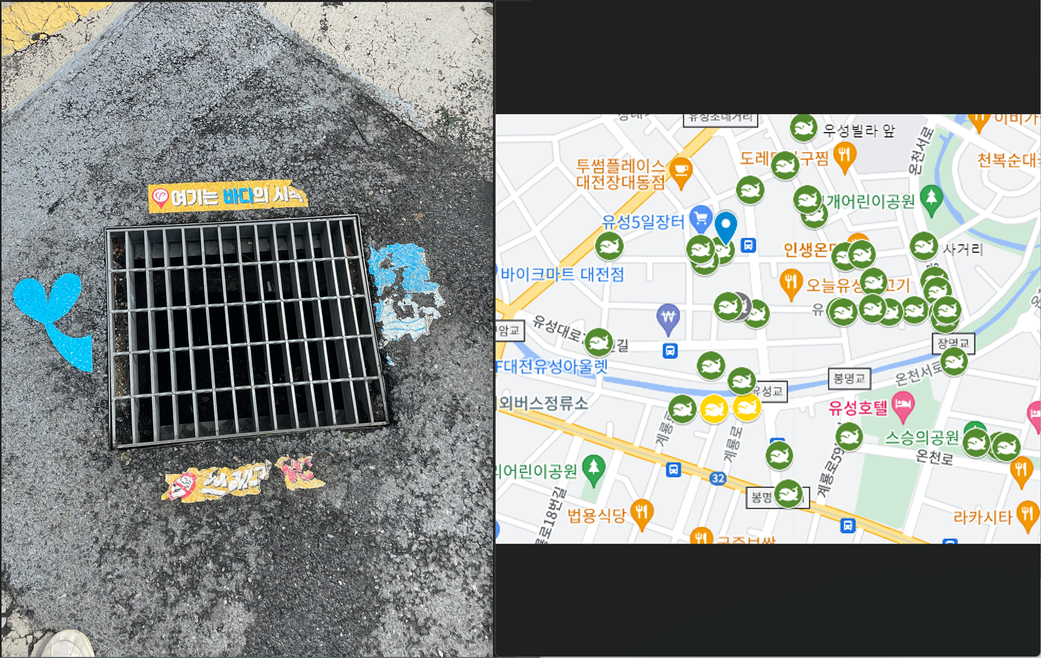 이를 해결하기 위해 스티커 대신 다른 대안을 고민하는 상황입니다. 다만, 지금 현재로서는 스티커 떨어짐 문제를 해결하기 위해 부착한 스티커를 모니터링하고 관리할 수 있도록 구글맵을 활용하여 매월 한 번씩 스티커를 부착한 위치에 방문하여 빗물받이를 청소하고 스티커의 상태를 사진과 글로 기록하고 있습니다.