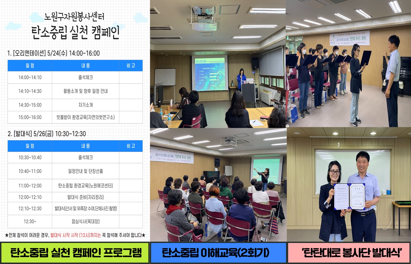 노원구 자원봉사단체 10곳에 유선연락 후 자원봉사단체 5곳이 탄소중립 기초교육에 참여하였으며