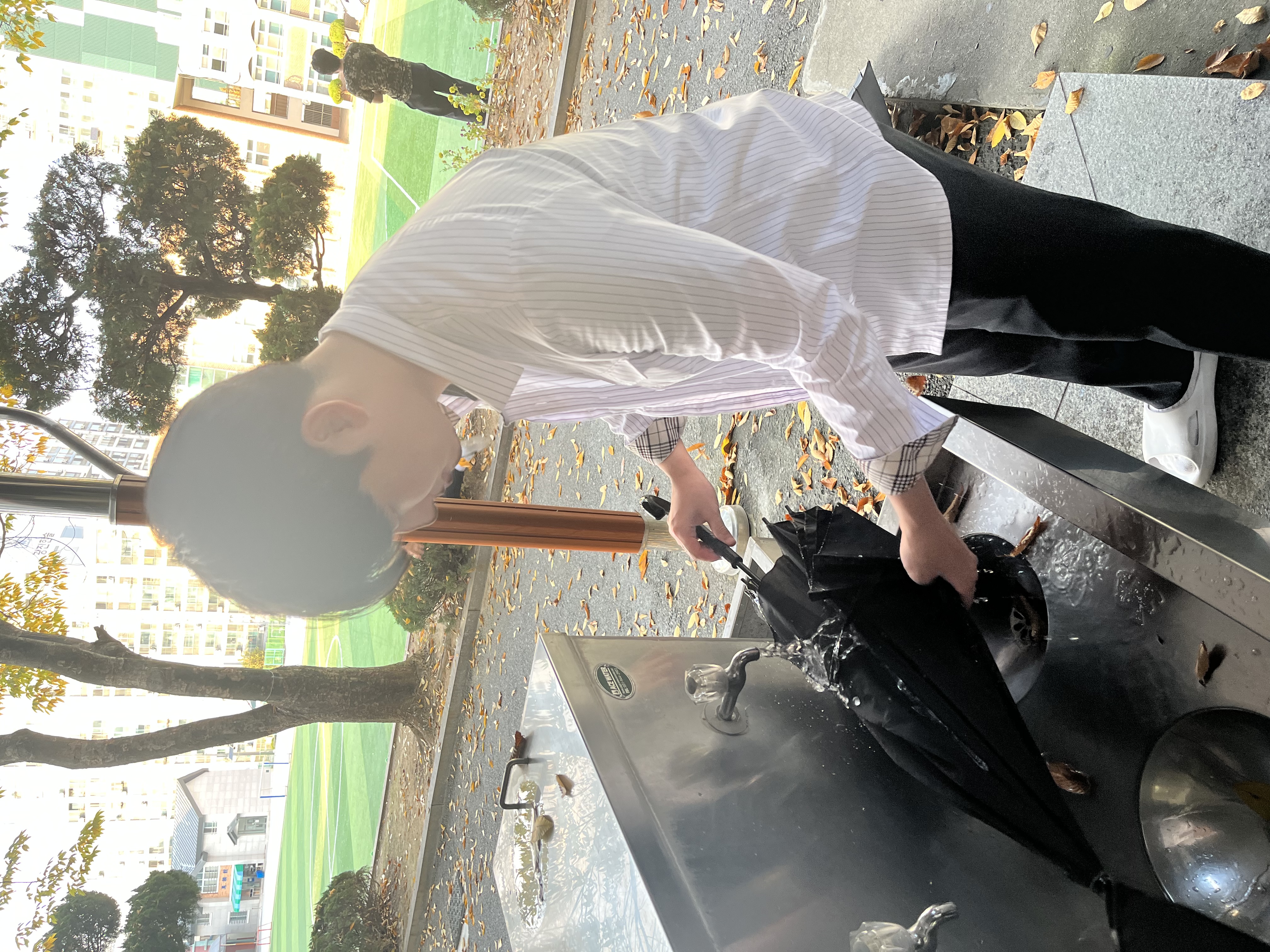 저는 일단 학교 쓰레기통에가서 구멍이나 버리진 우산들을 모아봤었습니다 . 그리고 이우산들을 물로 씻어 말렸습니다 . 다음으로는 학교선생님께 양해를 구한뒤 일회적으로 쓰고 버려진 플라스틱 재질인 간판들을 모았습니다. 그리고 구멍난 우산 비닐들을 가위로 다 제거한뒤 자로 직접 길이를 다 측정하여 우산 규격에 맞게 간판을 잘라 모았습니다. 그런 후 지지대에 끼워 맞춰 일회용 간판으로 만든 우산을 제작하였습니다!!