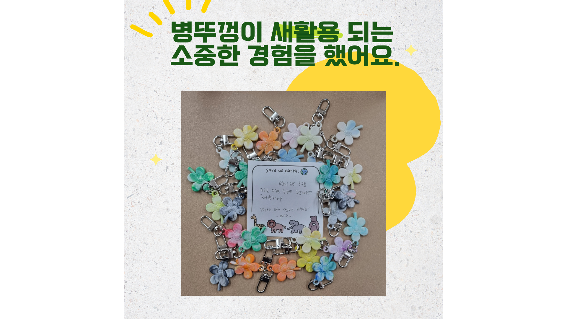 우리가 모은 병뚜껑을 기부한 기업에서 병뚜껑을 키링으로 새활용해 주셨습니다. 폐플라스틱이 가치 있는 물건으로 새로 태어나는 경험은 저희에게 무척 소중했습니다. 병뚜껑 데이 이후에도 꾸준히 우리가 사용한 병뚜껑을 모으고 다른 반 친구들에게도 홍보하여 병뚜껑을 대구에 있는 새활용 기업에 기부하였습니다. 병뚜껑을 모으면서 플라스틱 사용과 배출에 대해 반성하고 기후위기에 대해 더욱 관심을 가지게 되었습니다.