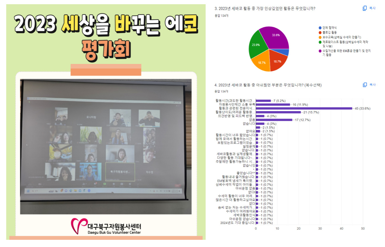 ○저탄소 실천을 위한 봉사프로그램 선정하고 계획하는데 있어 봉사단체의 다양한 의견을 반영하려다 보니, 활동 대상자에 따른 활동 난이도를 다소 고려하지 못한 점이나 봉사단체가 정기적으로 모여 기후위기 대응 탄소중립에 대해 함께 고민한다거나 봉사단체가 연합으로 많은 지역민들에게 기후위기의 심각성, 탄소중립 실천을 알리는 캠페인 등을 실시하지 못했다는 점이 아쉬웠습니다.