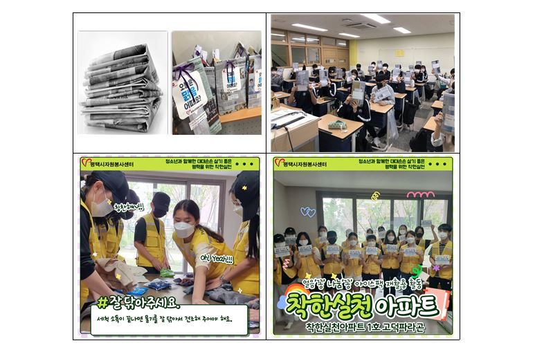 - 평택시자원봉사센터에서는 지난 2019년 일회용 비닐봉투 사용을 줄이기 위해 폐신문을 활용한 친환경 봉투 만들기 활동을 전개하고 이를 지역 마트에 무료 배부하여 환경 보호에 동참하고자 하였습니다.