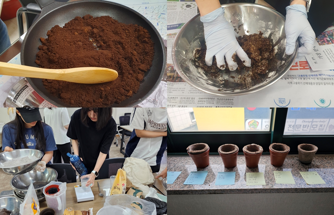더불어 커피박 새활용 물품의 완성도를 높이는데 있어서 필요한 천연추출물은 대신하여 분말의 점토화 과정에서 필수적인 물, 밀가루 등 첨가물의 종류와 배합시의 적정 비율을 찾기 위한 연구활동을 진행하며 나름의 해법을 찾기도 했습니다.