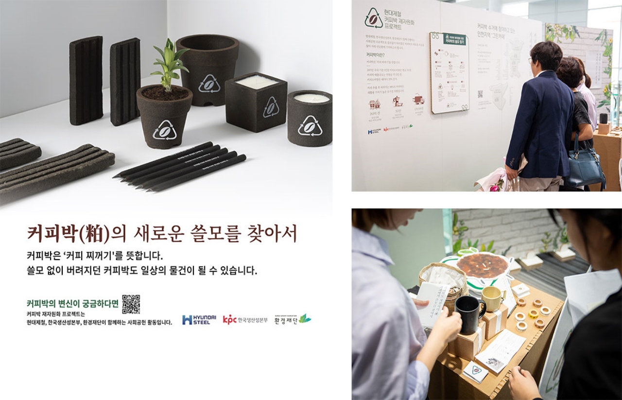 현대제철·한국생산성본부·환경재단은 사회공헌활동의 일환으로 커피박 재자원화 프로젝트를 운영하여 인천시 자활근로와 연계한 커피박 수거와 제품 생산·판매를 지원한 비즈니스 모델을 만들었습니다. 이러한 노력은 인천시가 지자체 차원에서 커피박 재자원화에 관심을 갖고 적극행정을 할 수 있는 기틀을 만들었다는 큰 성과를 만들었습니다.