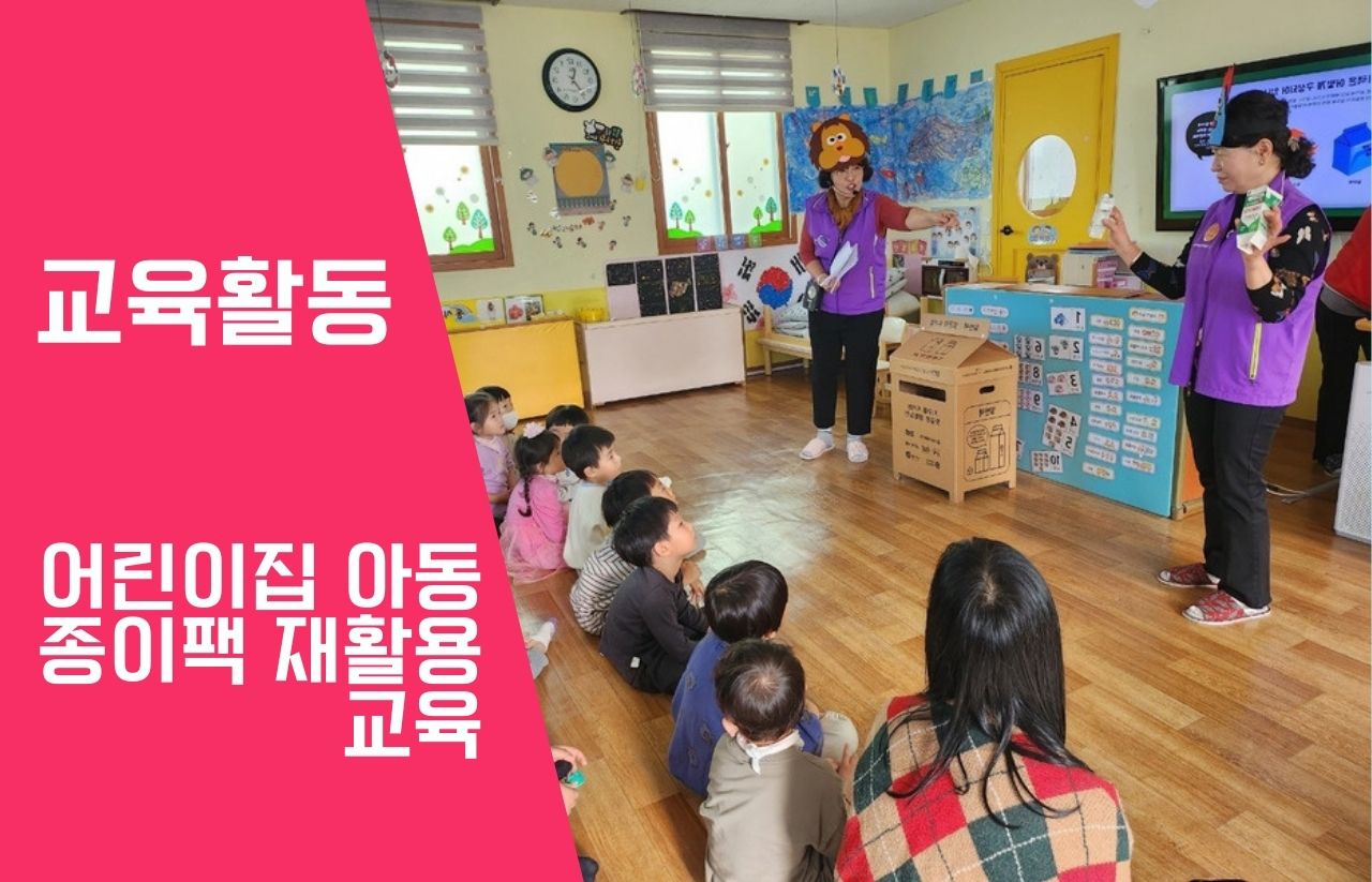- 종이팩 수거를 하지 않는 어린이집을 순회하며 종이팩 재활용의 중요성에 대해서 교육을 하고 있습니다. 아이들의 교육은 곧 부모들의 교육이 되고 아이들이 변하는 부모도 변해갈 것이라는 생각에서 시작하였습니다.