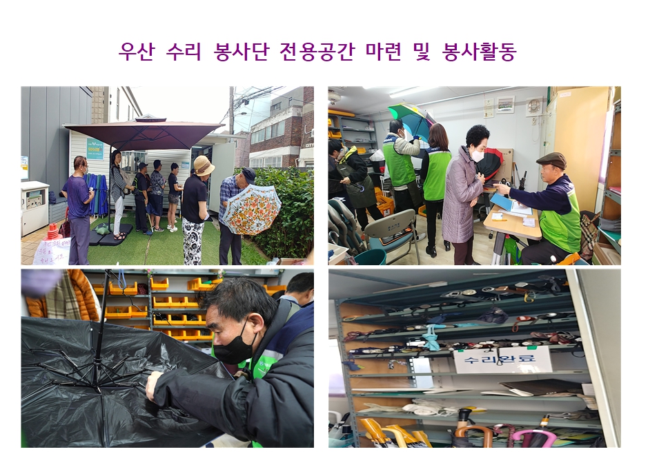 - 우산수리 봉사단 전용 공간 확보 ☞ 2024년 2월: 기관장(구청장)의 탄소 절감 및 봉사 활동 격려