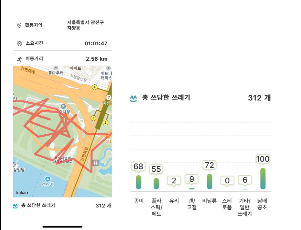 플로깅 후 쓰레기에 대한 문제점에 대해 파악은 했지만 개선책을 어디에 전달해야 할지 몰라서 팀원끼리만 아이디어를 공유하는 정도로 그치게 되었습니다.