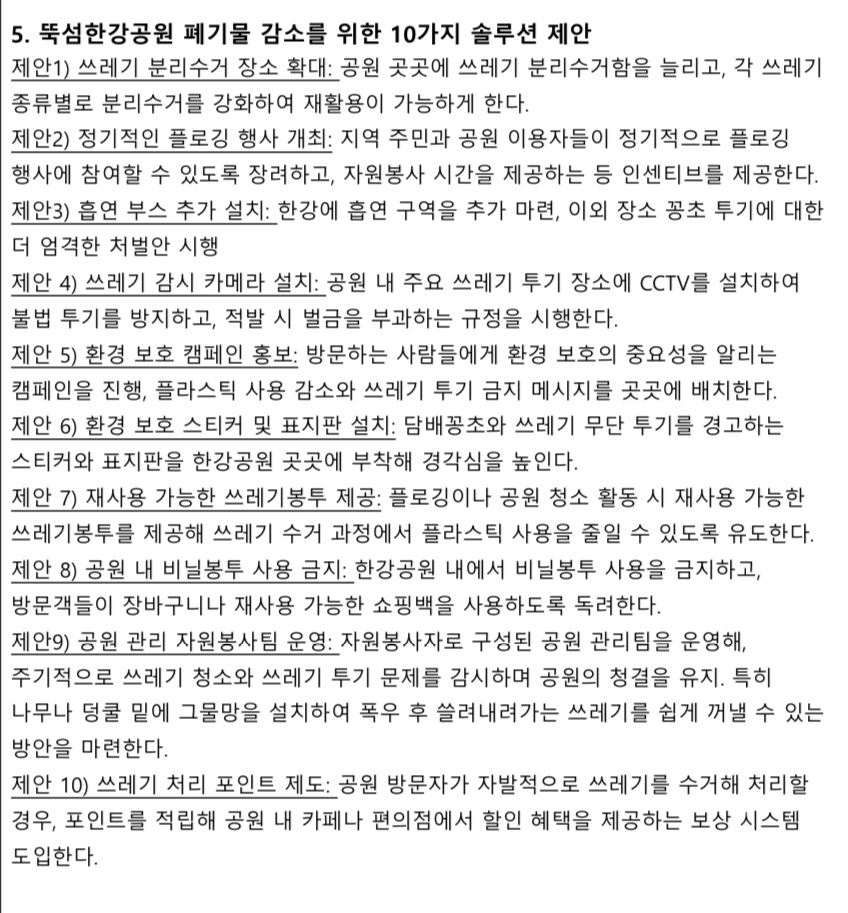 플로깅을 좀 더 재밌게 만들어 더 많은 청소년들과 많은 사람들이 참여할 수 있으면 좋겠고 플로깅에서 끝나는 것이 아니라 더 나아가 플로깅 한 곳이 개선될 수 있는 방안을 마련하는 것이 필요하다고 생각하였습니다. 예를 들어 저희 활동처럼 보물 찾기를 하던지, 주운 쓰레기로 재밌는 사진 찍는 콘테스트 등등 재밌는 활동을 같이 플로깅 할 때 하면 좋을 것 같습니다. 또한 플로깅한 후 개선할 사항들을 제안할 수 있는 웹사이트를 만들어 많은 사람들이 플로깅 후 느낀 점과 개선책들을 모아 의견이 반영될 수 있게 할 수 있으면 좋겠다고 생각했습니다. 뚝섬 같은 경우 한강에 흡연 구역을 마련해서 그곳 이외에서 피우면 벌금을 내게 하는 방안을 마련하여 담배꽁초를 아무 곳에 나 버리는 일이 일어나는 것을 방지하고 그리고 나무나 덩굴 밑에 그물망을 설치하여 폭우 후 쓸려내려가는 쓰레기를 쉽게 꺼낼 수 있는 방안을 마련하는 방안을 생각해 내어 많은 사람들에게 알리고 의견을 모아 쓰레기가 증가하는 곳에서 개선 방안들이 실현될 수 있으면 좋을 것 같습니니다.