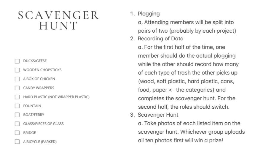 플로깅에 참여하는 학생들을 3개의 팀으로 나누고, 플로깅 하는 동안 한강에서 찾을 수 있는 보물 찾기 리스트를 주었습니다. 예를 들면 찾기 힘든 쓰레기인 치킨 뼈 또는 한강에서 볼 수 있는 오리 배와 같은 것을 찾아서 사진을 찍고 먼저 모든 보물을 찾는 팀이 이기는 겁니다. 또한 지구쓰담 앱을 통해 쓰레기를 주을 때마다 쓰레기 종류를 구분하여 어떤 종류의 쓰레기가 많이 나오는지 기록하였으며, 플로깅 동안 움직인 거리를 앱에서 확인할 수도 있었습니다. 청소년들이 보물 찾기를 하면서 재미를 찾고, 전자기기에 익숙한 청소년의 특징을 살려 지구쓰담 앱을 통해 걸은 거리와 장소, 주운 쓰레기 종류와 수도 바로 확인하면서 게임처럼 플로깅을 할 수 있게 하였습니다. 또 플로깅 후에 개선점을 생각하여 더 나은 환경을 만드는 교훈도 있는 활동이 될 수 있도록 기획하였습니다.