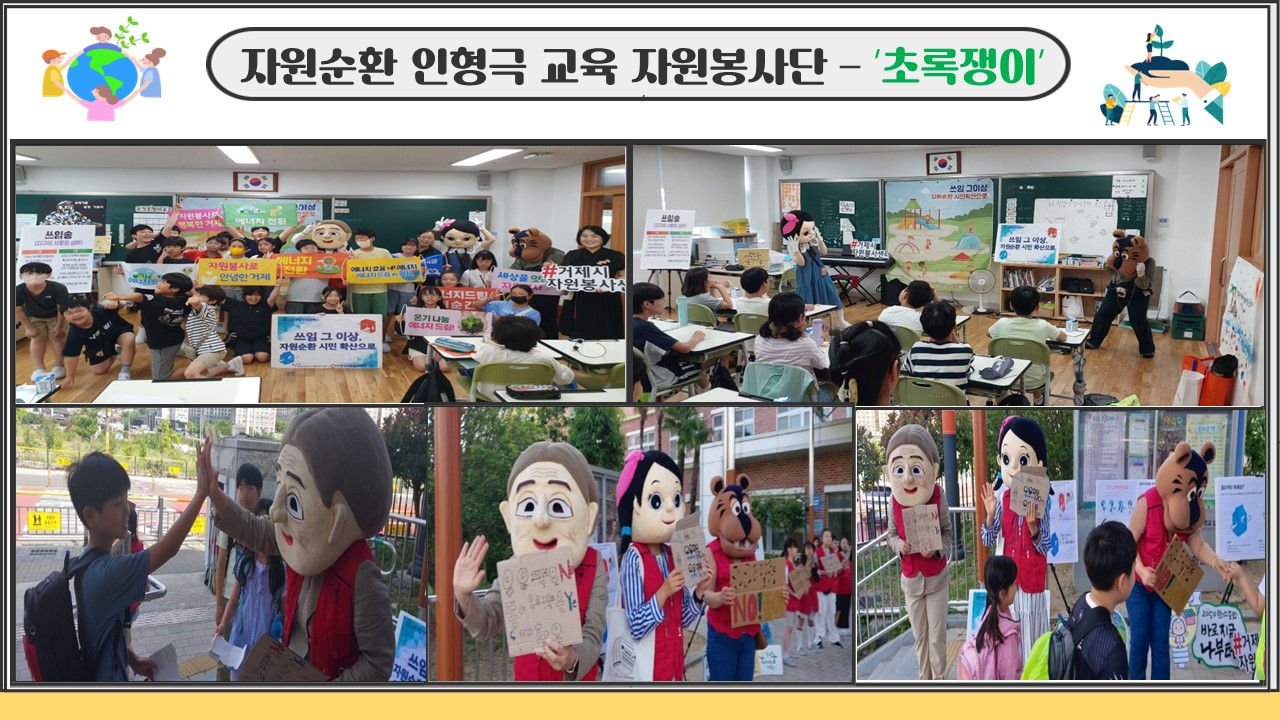 자원순환 인형극 전문교육을 받은 봉사자들은 자원=초록에 이르는 것에 목표를 두고 ‘초록’의 속성을 많이 가진 사람, ‘초록’과 관련된 일을 직업으로 하는 사람의 뜻으로 초록쟁이 자원봉사단을 구성하여 실제적인 활동을 펼치게 되었다.