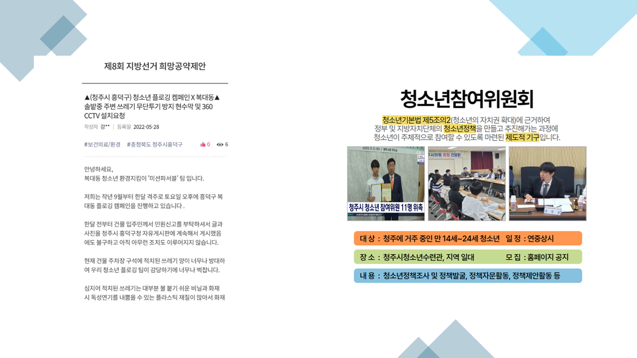 이번에는 우리 동아리 차원에서 우리들끼리 조촐하게 진행하였지만, 보다 많은 사람들에게 다가가기 위해 청주시 청소년 참여위원회에 참여하여 미세플라스틱을 줄일 수 있는 정책 제안 활동을 하려고 합니다.